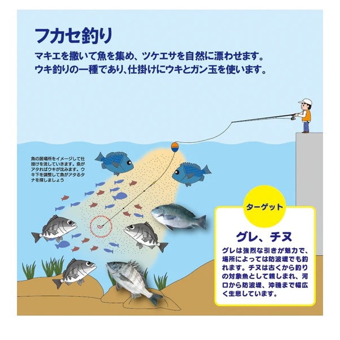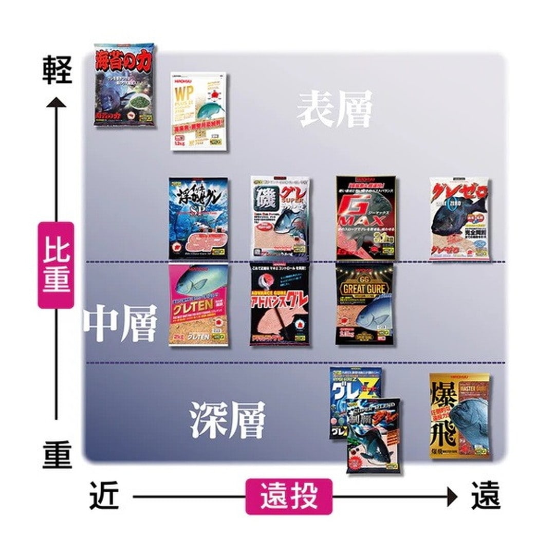 誘引効果をもたらすため、比重差のある具材を大量に配合しています。比重のある素材を軽比重の素材が後を追うため、上層から中層までバランスよく沈下します。喰い渋りのグレには特に効果的な配合エサです。