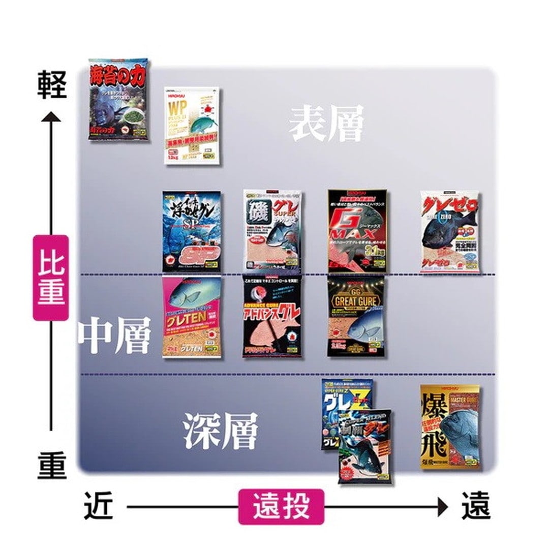 グレ用ブレンド材のニューフェイス!「高拡散&超遠投」「容量3.1k」軽い素材と粗い粒子のベストバランスにより、高い拡散性と超遠投性能を備えています。視認性に優れた赤いスロープが高い集魚力を誇り、グレを寄せて食わせます。