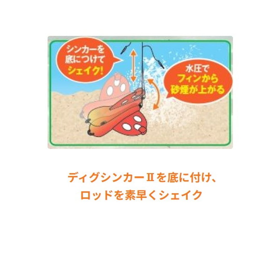 トラフグ釣りに特化した喰わせ仕掛けです。海底に着けてロッドをシェイクすると砂煙幕をあげるディグシンカー2をオモリに採用。産卵行動を模したアクションでトラフグに猛アピールできます。カラーはベースモデルとは別に、トラフグに特化した「パールホワイト/ケイムラ」「オレンジ/金」「クロ /金」の 3色をご用意いたしました。鈎は大型対応の強靭な鋼製 5/0 サイズ。エサがズレない軸長Wケン付き金鈎を採用しています。