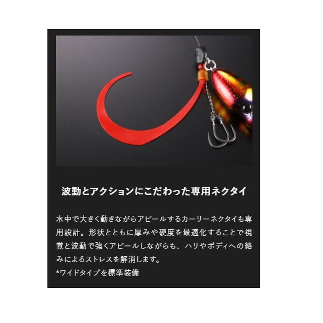 ●コンパクトシルエット。ヘッド、スカート、ネクタイが一連の従来の漁具型ルアーと異なり、ボディとネクタイ+フックを別パーツとして構成。さらに並列にセットしボリューム感を抑えたことでコンパクト化を実現。ボディへのバイトもフッキングに持ち込みます。●二枚潮をつき抜ける直進性能。流線型ボディをぶら下がり式にセッティング。水の抵抗を抑えた整流効果によって潮流に負けない速いフォールとファストリトリーブでもバランスを崩さず安定したアクションを可能にしました。●あらゆる魚種がターゲット。マダイ、ブリ、ヒラメ、アコウやカサゴなどのロックフィッシュまで、幅広いターゲットでオフショアゲームを楽しくします。●タングステン仕様。高比重タングステン素材を採用。コンパクトシルエットを実現すると共に、沈下速度が早く、底取りのし易さも大きな特徴です。●遊動式スイッチシステム。専用設計されたスライドパーツは、ラインへのダメージを極限まで抑える耐摩擦樹脂を採用。遊動仕様によりバラシを大幅に軽減します。ボディ本体はスプリットリングにて交換可能です。