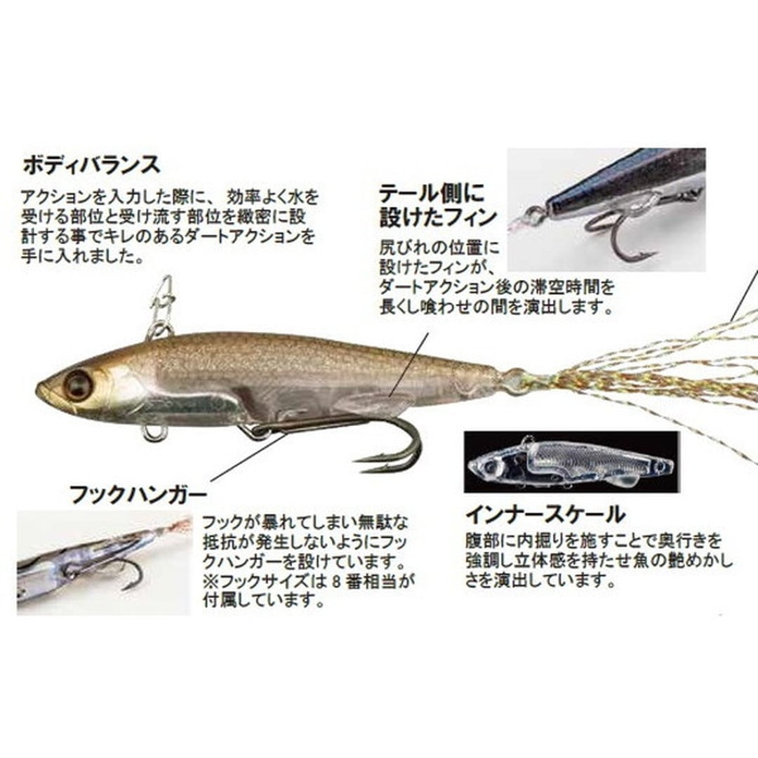 水中ボイルを発生させるトリガーアクション。捕食スイッチを入れる、キレのあるダートアクション。様々な方向に素早く、イレギュラーにアクションすることでフィッシュイーターの捕食本能を刺激します。食わせの間を演出する滞空時間の長いダート。キレのあるアクションに狂った魚に対して、喰わせの間を与える滞空時間の長いダートに拘り設計を行いました。キレのあるダートを支えるフックハンガー。フックをボディに固定する事で、無駄な抵抗を減らしキレのある滞空時間の長いダートアクションを手に入れました。魚が掛かるとフックはハンガーから外れます。