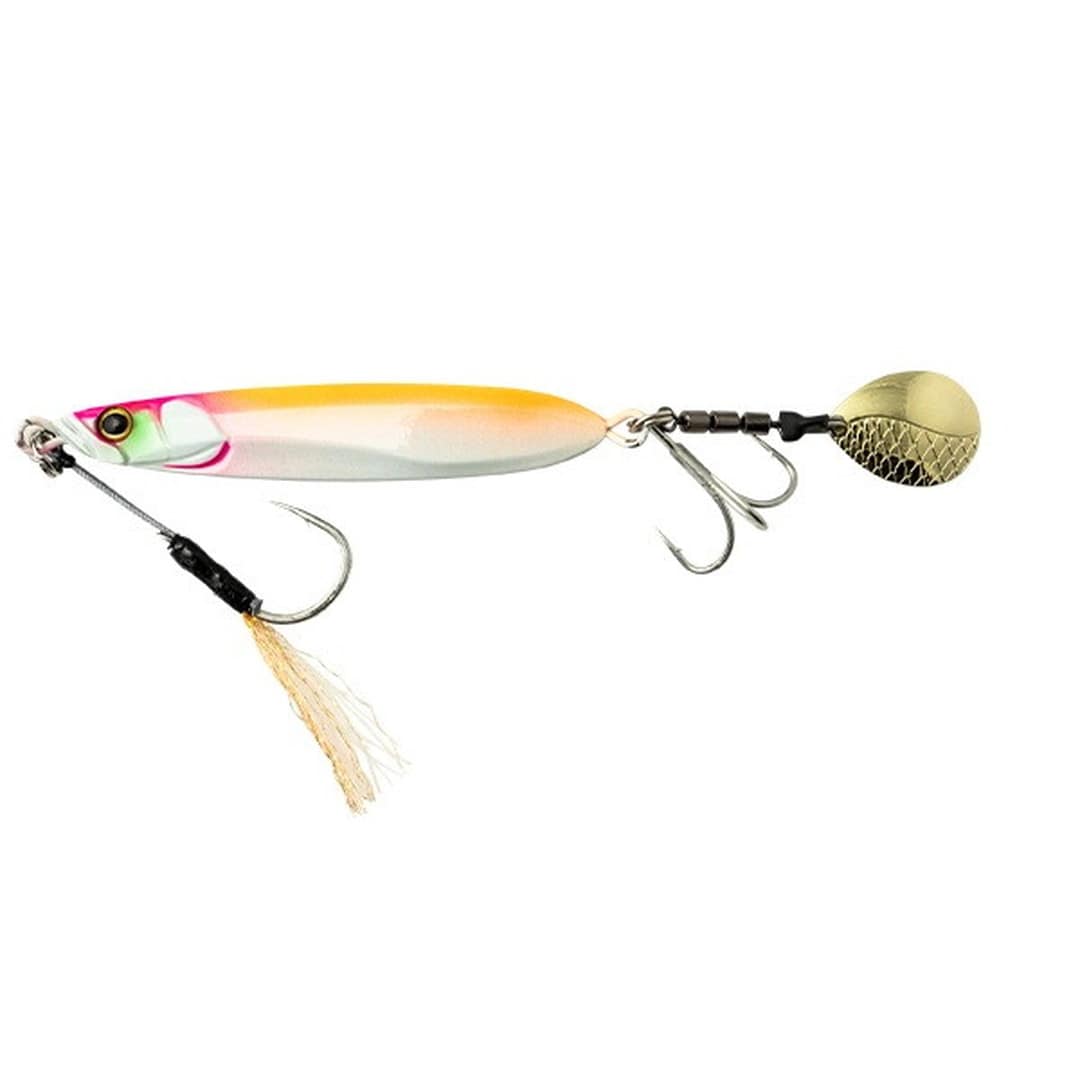 ただ巻きでOK 扱いやすさにこだわったブレードジグ。●ただ巻きOKのカンタン操作。ジャーキング・シャクリなどの難しいアクションは必要とせず、ただ巻きだけでオートマチックに釣れるアクションを演出し、青物を魅了します。操作感や飛距離、トラブルレス性能にも徹底的にこだわり、より快適に・より簡単に堤防青物を攻略することができます。●ハイバランス設計で快適な使用感。堤防・沖堤防での使用を想定し、ボディ・ブレード・アイ・フック・その他パーツに至るまで様々な要素でベストバランスを追究。安定した姿勢で低速~高速巻きまで対応するうえ、狙ったレンジを外し難く、足場の高い堤防でも足元近くまで巻き続けられる高いレンジキープ力を持ちあわせます。※最適なアクションを出すため、角度調整されたアイを採用しています。開封時のままご使用ください。●止めていても誘い続ける。フリーフォール・テンションフォール中もしっかりとブレードが回転し続けるため、ただ巻き後に「止め」を入れた際にもブレードが誘い続け、見切る隙を与えることなくバイトに持ち込むことができます。