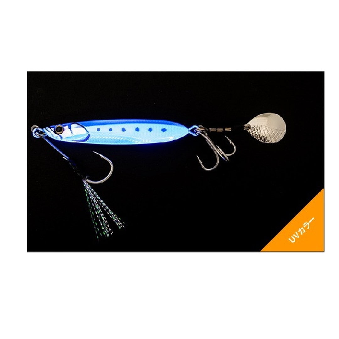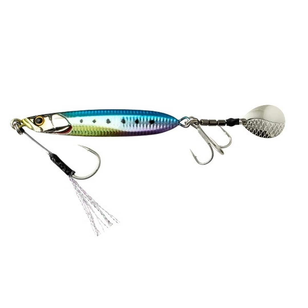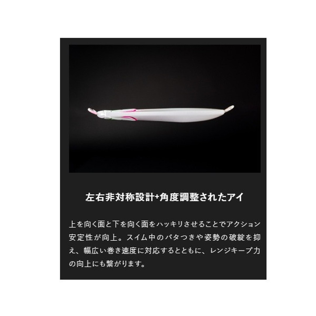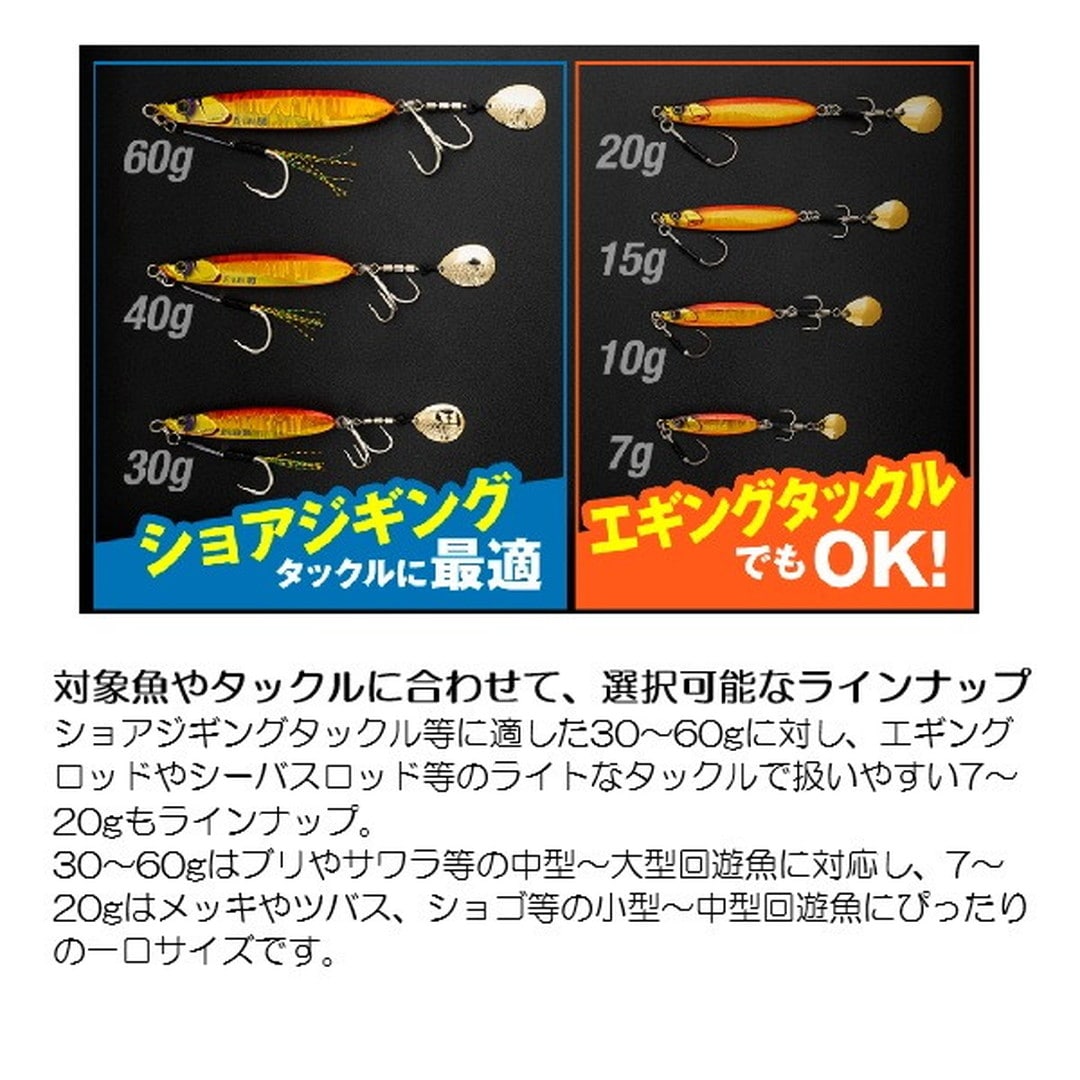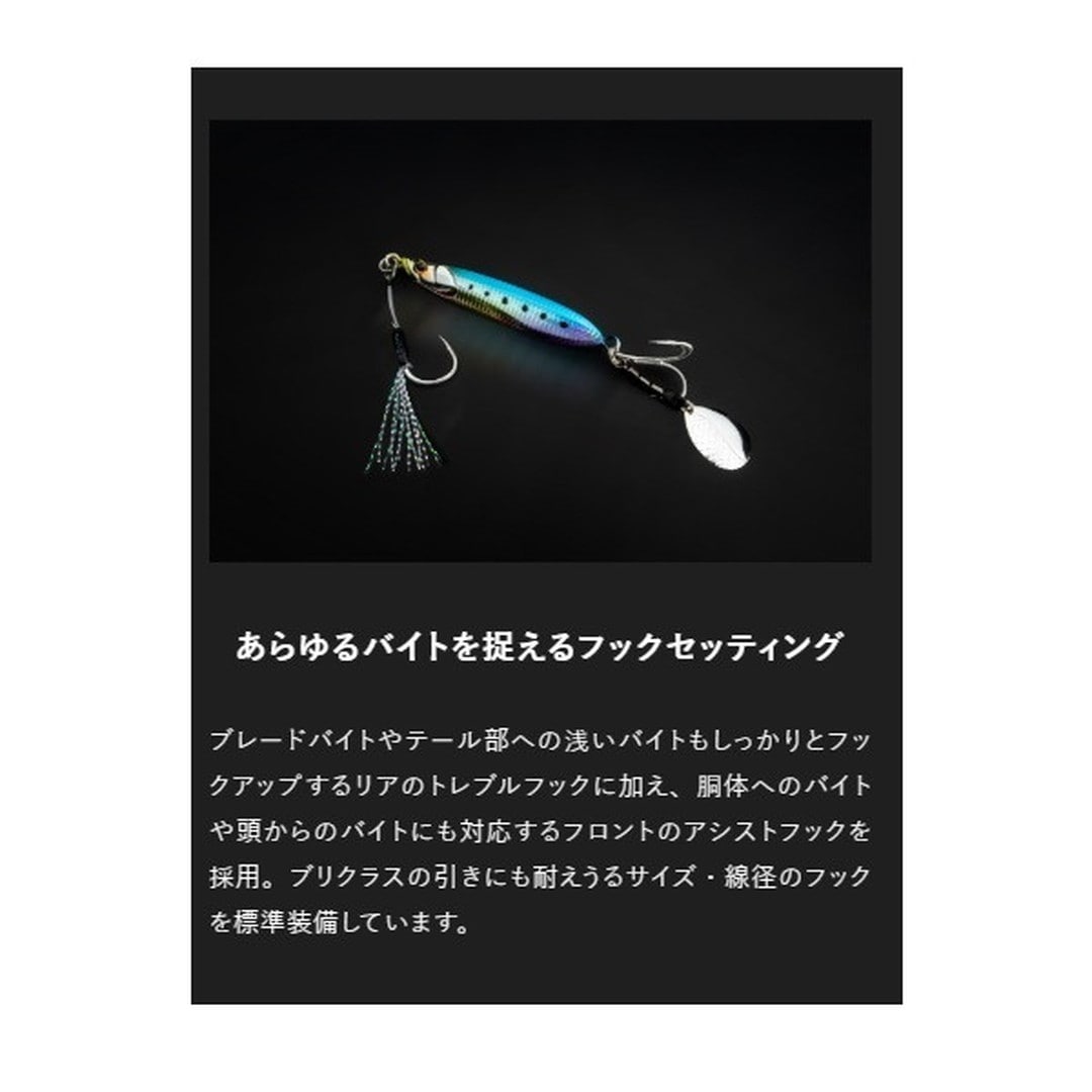 ただ巻きでOK 扱いやすさにこだわったブレードジグ。●ただ巻きOKのカンタン操作。ジャーキング・シャクリなどの難しいアクションは必要とせず、ただ巻きだけでオートマチックに釣れるアクションを演出し、青物を魅了します。操作感や飛距離、トラブルレス性能にも徹底的にこだわり、より快適に・より簡単に堤防青物を攻略することができます。●ハイバランス設計で快適な使用感。堤防・沖堤防での使用を想定し、ボディ・ブレード・アイ・フック・その他パーツに至るまで様々な要素でベストバランスを追究。安定した姿勢で低速~高速巻きまで対応するうえ、狙ったレンジを外し難く、足場の高い堤防でも足元近くまで巻き続けられる高いレンジキープ力を持ちあわせます。※最適なアクションを出すため、角度調整されたアイを採用しています。開封時のままご使用ください。●止めていても誘い続ける。フリーフォール・テンションフォール中もしっかりとブレードが回転し続けるため、ただ巻き後に「止め」を入れた際にもブレードが誘い続け、見切る隙を与えることなくバイトに持ち込むことができます。