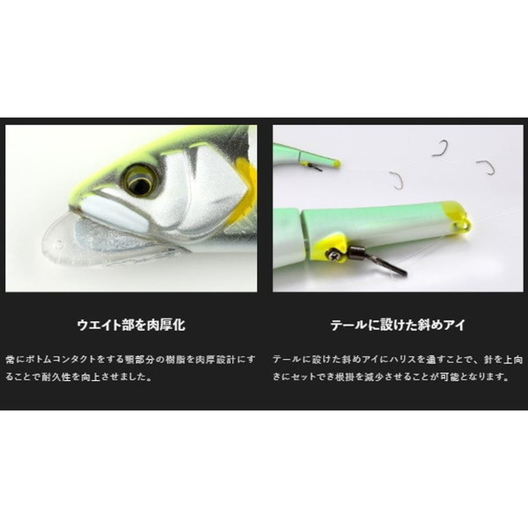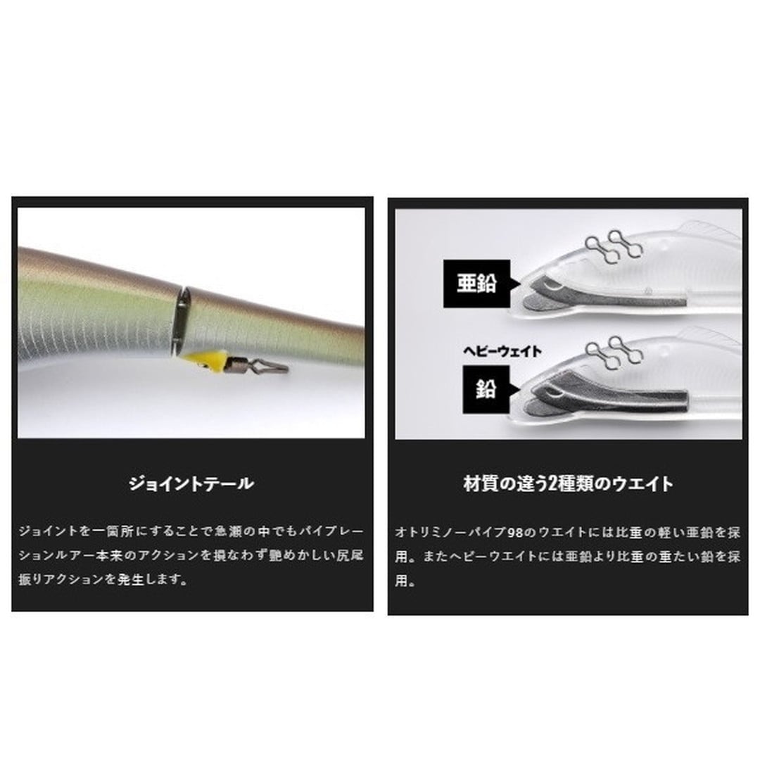 流れの強い急瀬など、リップ付きルアーでは攻めきれない状況でもリップレスの為、動きが破綻しにくく、まるでアユが苔を食んでいるかのように艶めかしいアクションでアピールします。ボディー2か所に設けられたアイにより頭よりのアイはタイトロールアクション、後部アイは煌きの強いロールアクションとなっております。オトリバイブをドン深エリア攻略用にヘビーウェイト化。ルアーを素早くボトムに送り込む事ができ、強い流れの中でも底岩を舐める様に引いてくる事が可能です。特に終盤の深場に落ちた大型アユ攻略にも威力を発揮します。