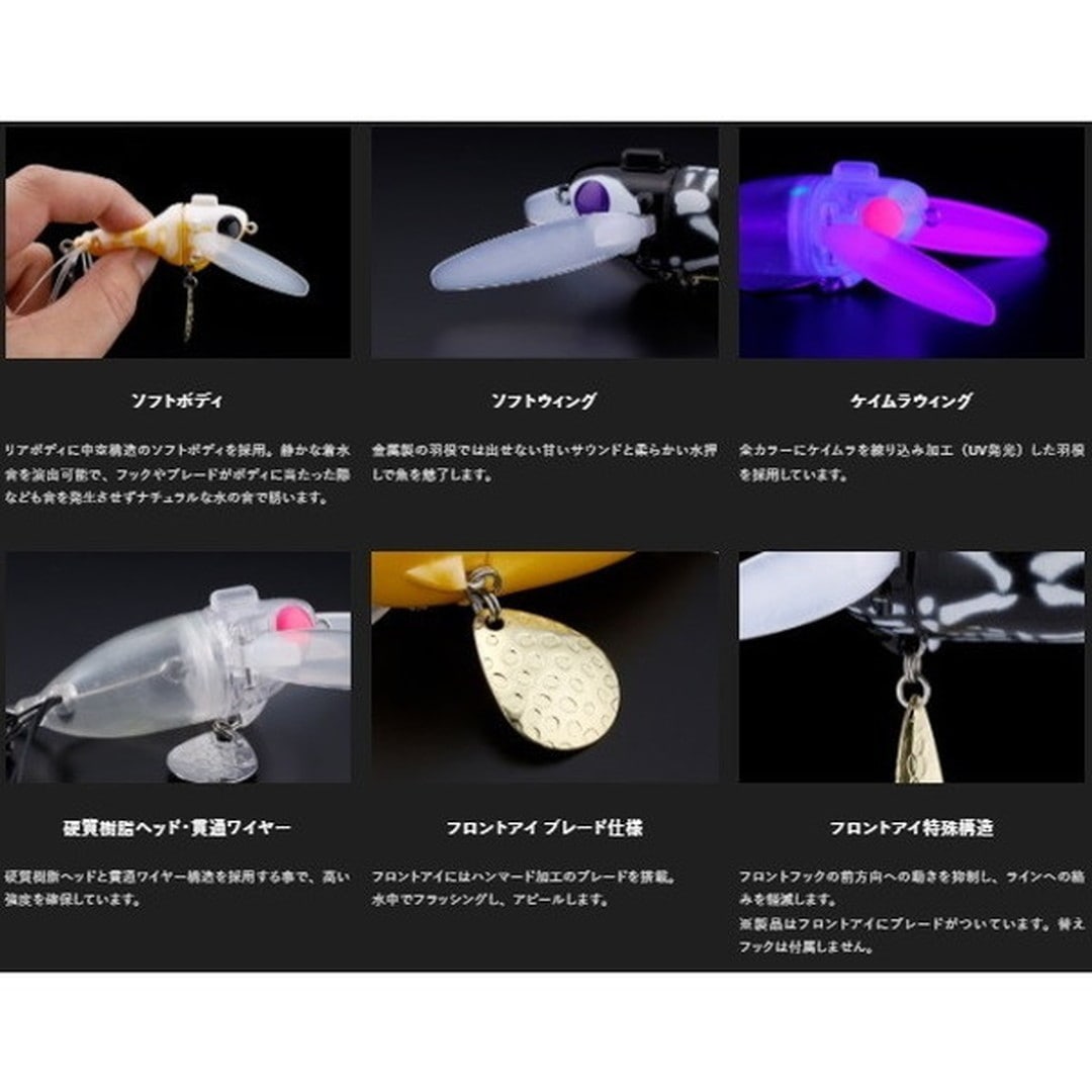 リアボディには中空構造・ソフト素材を採用。ソフトでナチュラルな着水音で魚に違和感を与えません。また、ボディとフックの接触音を抑えることで余計なプレッシャーを軽減します。ソフトウィングならではの独自のサウンドと柔らかい水押しで魚を魅了します。ボディに対してやや下向きに設定したソフトウィングのポジションはアクションレスポンスを追求しており、軽くラインテンションがかかるだけでアクションを開始し足場の高いポイントでの使用も可能です。