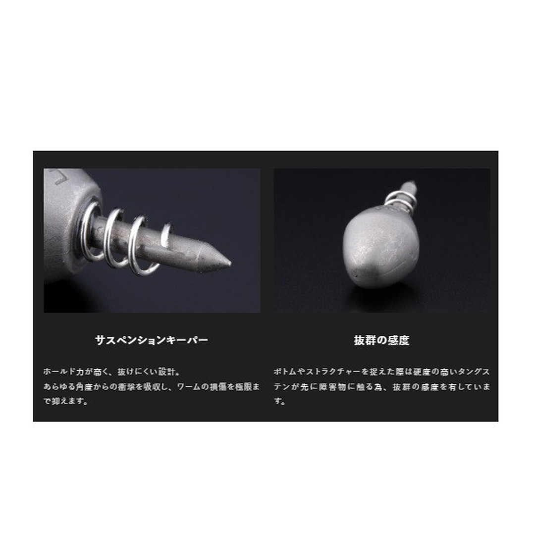 刺しやすく、抜けにくい。対カバー専用ネコリグシンカー。●簡単に真っすぐ刺せる。抜けにくい。シンカーの中心部にガイドラインとなる円錐を設計することで、狙った場所に真っすぐシンカーを挿入することが可能です。また、細軸のサスペンションキーパーはワームとの喰いつきが良いため、保持力が格段にUPしています。● カバーの中で「誘う」ために必要不可欠なウエイトラインナップ。パワーフィネスの釣りは、ラインが枝などに触れていることが多く、カバーの中でリグがアクションしていないことが多いです。5g以上のウエイトを使用し下方向に引っ張る力を働かせつつ、ロッドアクションで上方向へ引っ張ることでルアーがしっかりと動き、バイトを誘発することが可能です。●ウエイトが集中する設計。ワーム内に収まるウエイトを極力少なくすることでシンカーの先端へウエイトが集中。カバーに対して真っ直ぐ貫くことが可能なため、カバー貫通力が非常に高いシンカーです。(3.5gシンカーでワームの外には90%以上の約3.1gのウエイトが集中しています。)