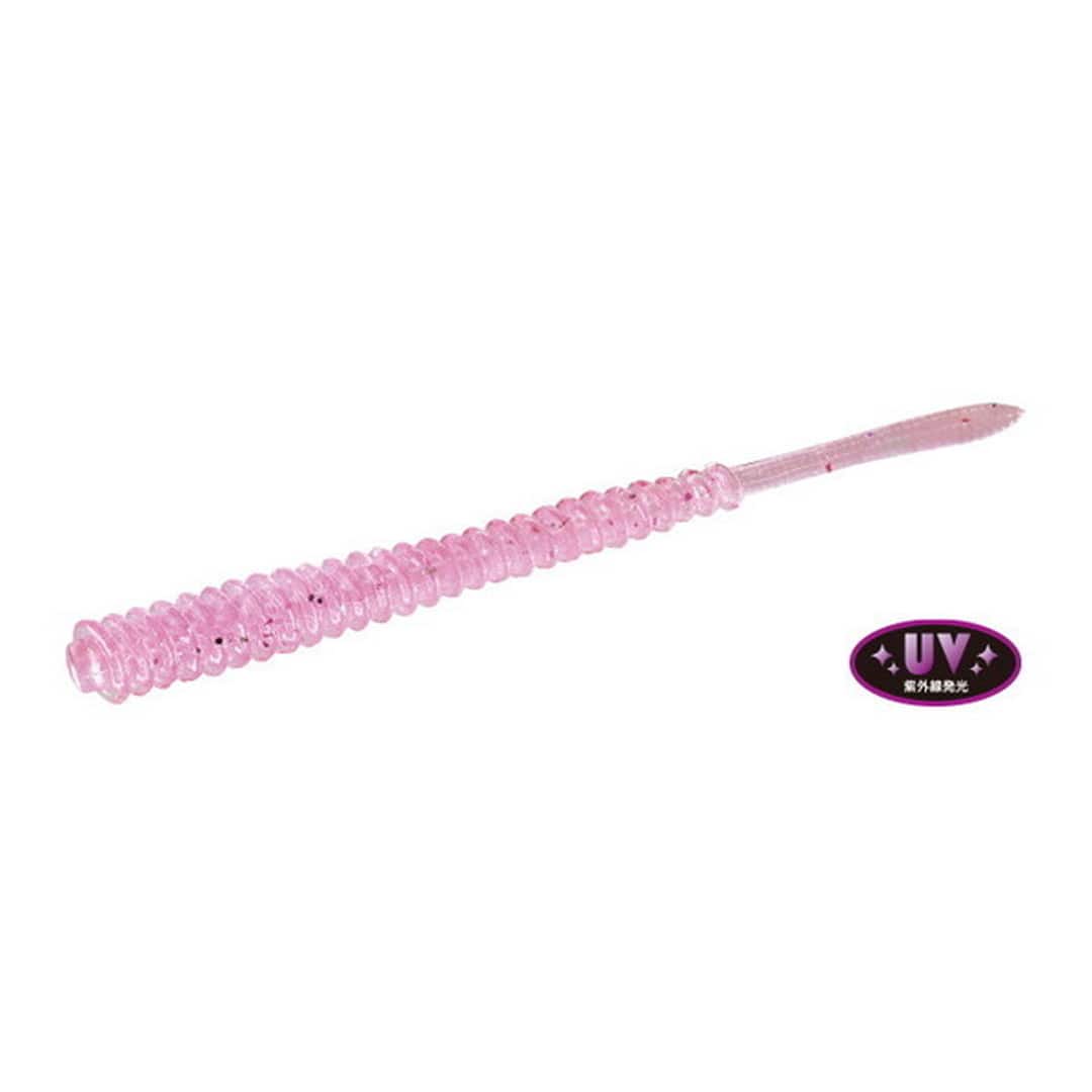 大型アジを狙う為に設計された3inワーム!斜めリブはジグヘッドの刺し方の違いによる使用法が可能。リブの形状は抵抗を受けたい前半は大きめ、深く吸い込ませたいボディ後半は小さめの設計。サイドからみると4:6のバランスでくびれを設置。この形状変化は、誘いのアクション後、アジが捕食し易い姿勢を取り、吸い込みの際フックのすぐ後ろまで折れ曲がる様になっている。さらに、テールの先端部にのみボリュームを持たせ、フォール・リフト中にテール先端部だけがプルプルと動きバイトに持ち込みます。またフックを刺す位置にはワームの裂け・ズレを軽減するリブも設置。従来のテトラワークス製品と同じマテリアルでありながらボディコア部のみ硬め。ロングワームで起き易いワームの絡みつきを抑える為と、アクション後の姿勢をよくする為である。