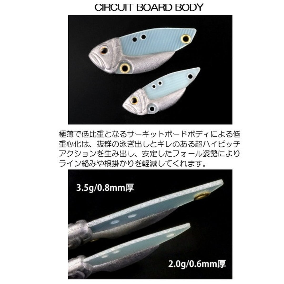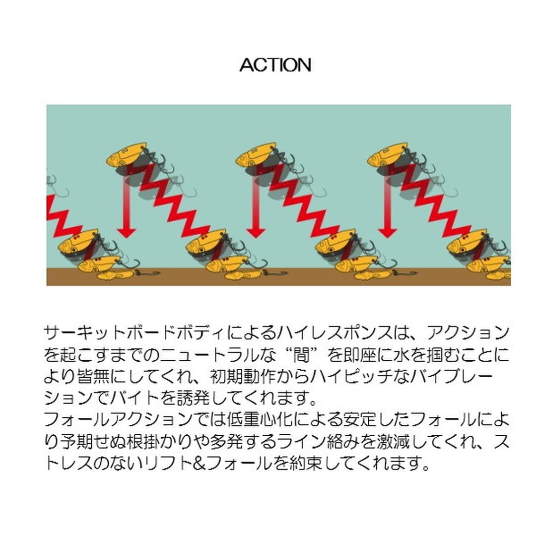 メタルを超えた鉄板バイブ。極薄で低比重のサーキットボードを採用した低重心ボディにより、抜群の泳ぎ出しとキレのあるハイピッチ&ハイレスポンスをみせる「サーキットバイブ」を、エリアやネイティブに生息するトラウトにアジャストさせたメタルバイブレーションです。また低重心ボディは安定した飛行姿勢と高いアキュラシー性能、そして安定したフォール姿勢によりライン絡みや根掛かりを軽減してくれます。