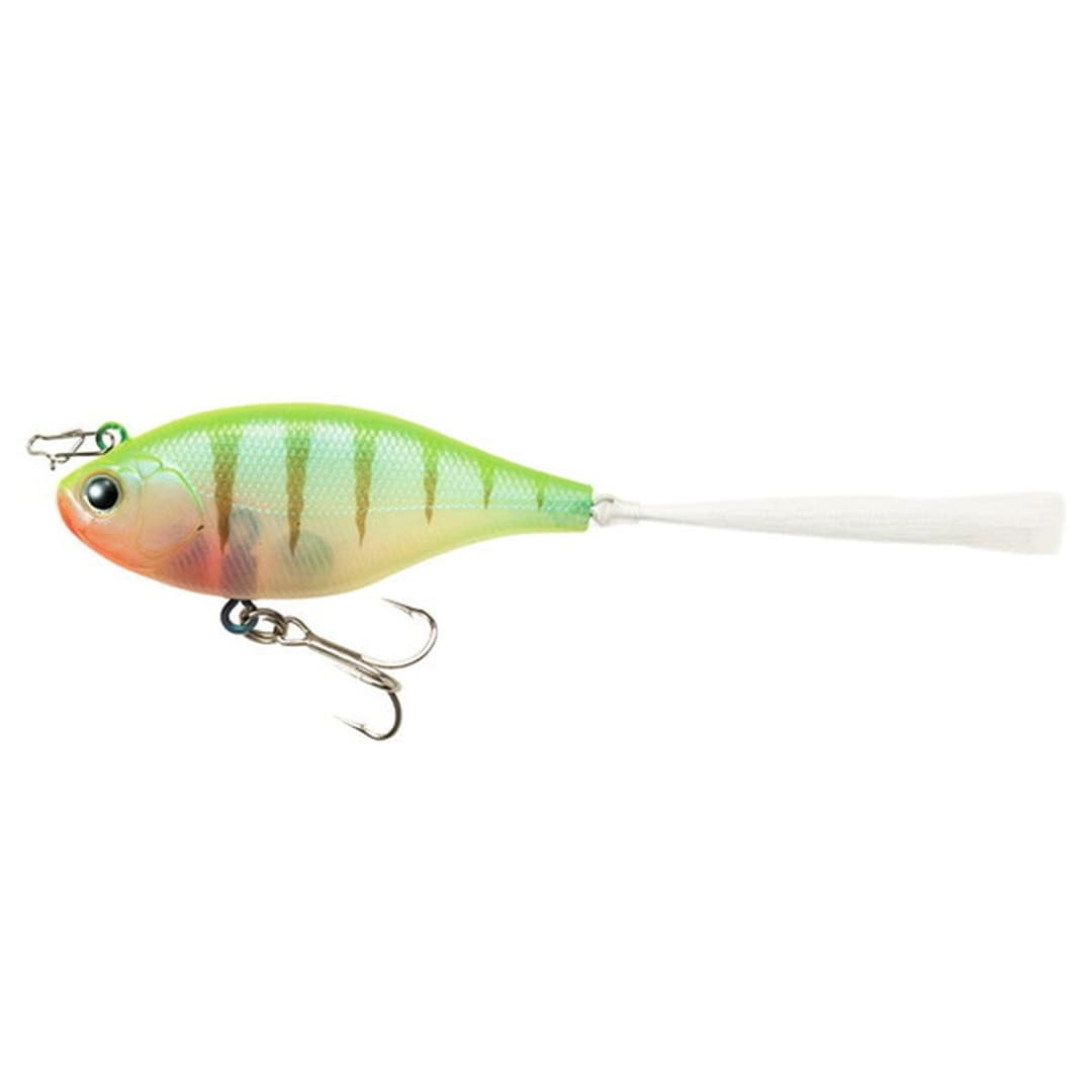 水面直下・水面の攻略法としてのI字系ルアーはとても効果的です。しかし、「見に来るが喰わない」そして「気がつかれない」ことが多いのもこの釣りの特徴。そこでトラファルガー5フラットは、喰わないバスに対しアングラー側から仕掛けられること、また存在感のあるアピール力を加えることのできるi字系を目指し開発を進めました。重要なのは、基本はI字状態でもシェイクしたときにはキレのあるアクションをすること。そのためアクション時のロールが強いルアーに仕上げています。バスが視覚に頼る、クリアウォーターでの使用が多いI字系。ローリングアクションによるフラッシングは、水の透明度が高ければ高いほど効果を発揮し、バスにアピール。たとえ無風状態でもスイッチを入れる力を発揮します。またテール部分に取り付けられた「TMCモルフォファイバー」は世界一美しい蝶、モルフォ蝶の発色原理を応用して作られた特殊繊維。屈折率の違う成分が幾十にも織り成して形成されているこの繊維は、光が当たると淡い自然な輝きを放ち、バスに最後まで見切られることなくバイトに持ち込みます。