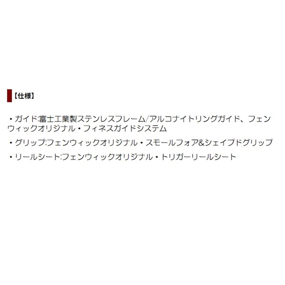 「ウルトラ フィネス スペシャル」近年一般化した、極細PEラインを意のままに操る使命をもって誕生したスペック。伸びのないPEラインを自在にコントロールしルアーを操るためには、ロッドに対し全く別の思想が必要であると考えました。そのためまず重要となったのはティップ部分の新構想でした。PEラインを使用し、モノフィラメントラインと同等のルアーアクションを行うには、最適化されたソリッドティップ部分の設計が必要不可欠。新設計されたソリッドティップは、PEライン使用時に起こるルアーに対しての不自然な動きを完全に排除。これにより、ルアーをより繊細に操作しバイトを引き出すことが可能になっています。あくまでもルアーのコントロール性能を重視するため、ロッド自体は一切の無駄をすべて注ぎ落し軽量・軽快さにこだわりました。このロッドの存在理由ともなった極細PEラインの操作性は、まさに異次元。マイクロホバスト等の各種マイクロベイトパターンや超ライトネコリグ、1g以下の超軽量ノーシンカーなど、かつてモノフィラメントラインには不可能だった領域をカバーすることが可能になりました。