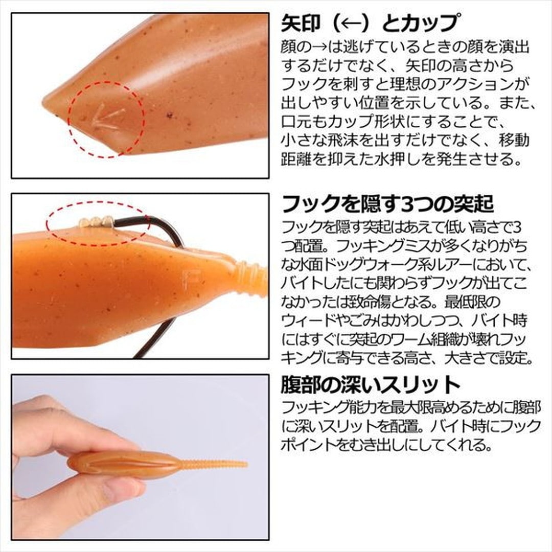 水面~水面直下で仕掛けるドッグウォーク系フローティングワーム!水面ドッグウォークジャンルには無いワーム素材採用。腹側の深いスリットがバイト時にフックをむき出しにさせることで、高いフッキング能力を実現。ロッドアクションの強弱で低速~高速アクション、水面~水面直下まで幅広く対応が可能。針先を隠す突起を配置することでカバーも怖くない!フック込で5gオーバー!ロングキャストが容易に決まるルアーとなっている。