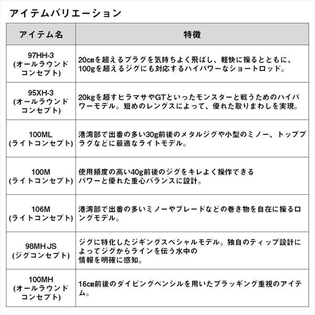 さらなる大物へアプローチ。リアルなルアー操作性と、粘り強いリフトパワーを持つショアジギングロッド。■103MB・・・港湾部の堤防や沖堤防でのセンターアイテム。手返しと巻き上げ力に優れたベイトタックルにより、使用頻度の高い40g前後のブレードや大型ミノーなどをスムーズにキャストして軽快にリトリーブできる。細身、軽量設計ながらブリやサワラに対応する強いバットパワーが魅力。