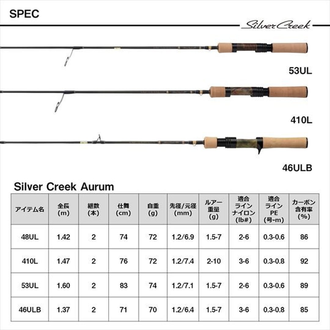 「Aurum」それはラテン語で「光り輝くもの」の意。金の元素記号「Au」の語源でもある。金の如く、手にしたものに優越感を与え、フィールドでキャストをすればその使用感に恍惚の表情をもたらす。調子はキャスト性能と掛け性能に特化、番手ごとに多用するキャストを設定しシチュエーションごとの攻略を容易に。ブランクはSVFカーボンを採用し、素材の反発から伸びのあるアキュラシーキャストを約束。外観は、黒系カラーをベースに、ゴールドのスレッド、文字を採用し、渓流の木漏れ日の中でその存在感を際立たせる。グリップ回りも、シルバークリークシリーズを踏襲した細径のウッドリールシートを採用。ガイドにはチタンSicガイドをダイワ独自のセッティングで配置。通常よりも径の大きなガイドは、キャスト時のラインの抜けの良さはもちろん、解禁直後の凍結や蜘蛛の巣によるトラブルを軽減。使用感、外観ともに拘り尽くした、新たなる象徴が誕生した。