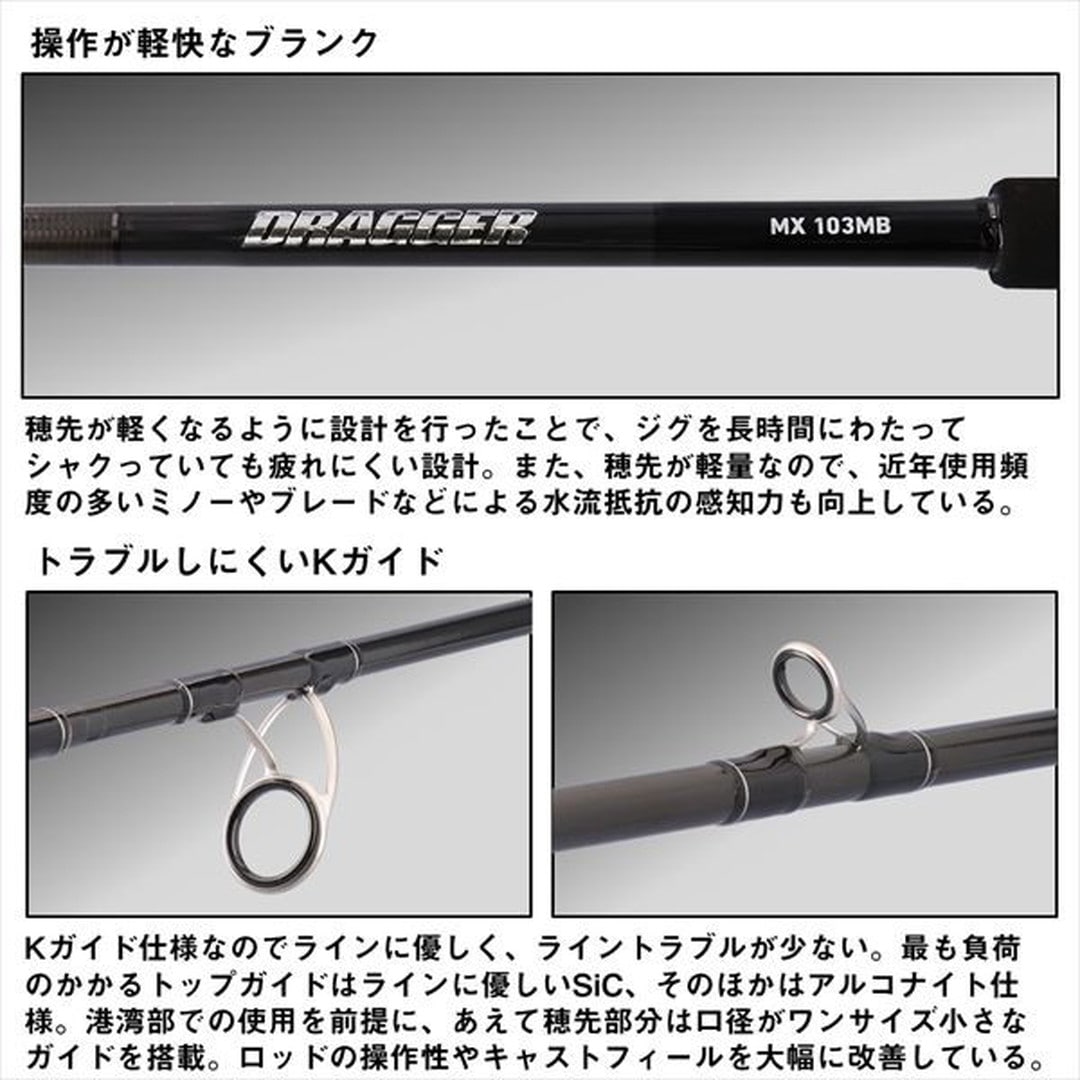 求めるのは「さらなる飛距離とキレのある操作性」軽量設計のこだわり湾岸ショアジギングロッド。■103M(スピニングモデル)・・・3kgクラスまでの青物を狙うのに最適なMパワーモデル。足場が高い堤防でのショアジギングを念頭に開発。遠投性とルアー操作性を高次元で兼ね備える絶妙なレングスとなっている。軽快にキャストを続け、足元までルアーをきっちりとトレースできるのが魅力。