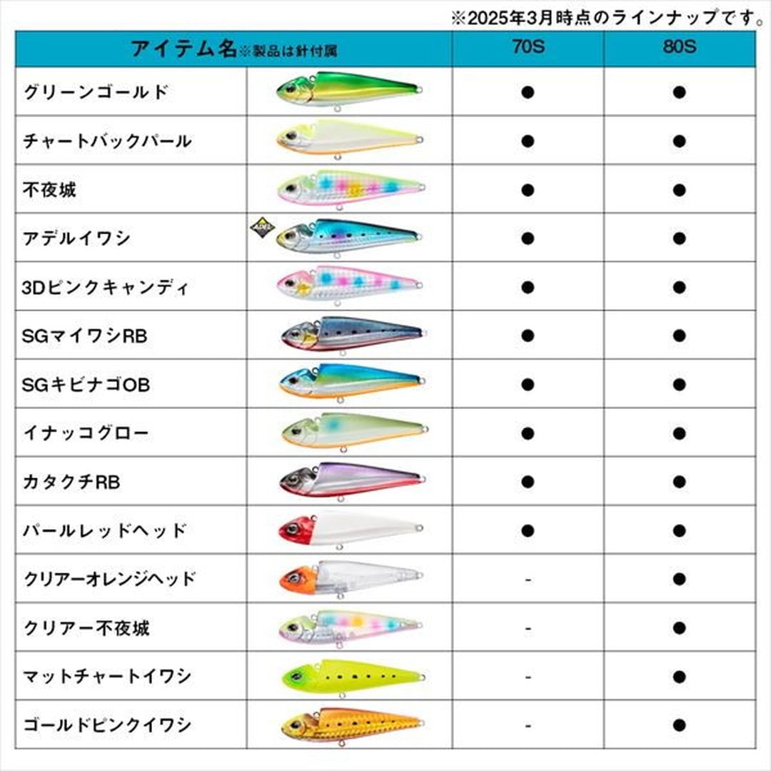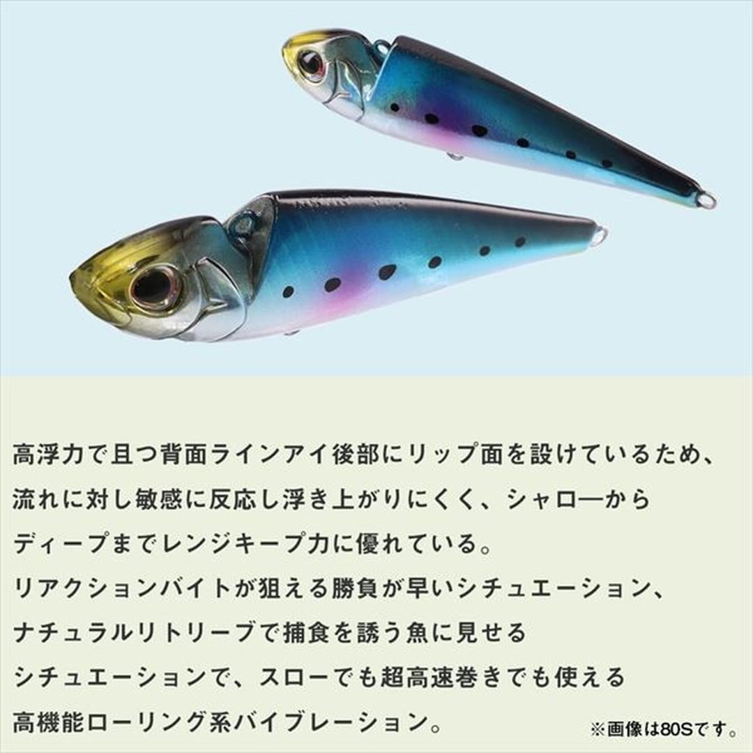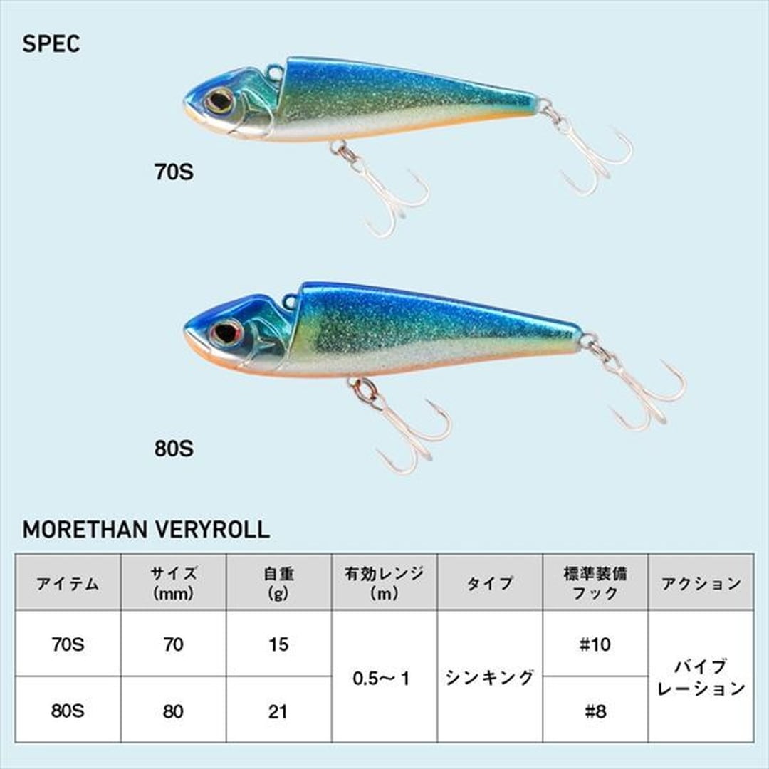 ソルトバイブシリーズに新たなアクションの追加!フィッシュライクなシェイプ&特殊なリップ形状とボディ構造により、8:2のローリング:ウォブリングアクション、水平に近いナチュラルなスイム姿勢、軽快な引き心地を実現したモアザンベリーロール。高浮力かつ背面ラインアイ後部にリップ面を設けているため、流れに対し敏感に反応し浮き上がりにくく、シャローからディープまでレンジキープ力に優れている。リアクションバイトが狙える勝負が早いシチュエーション、ナチュラルリトリーブで捕食を誘う魚に見せるシチュエーションで、スローでも超高速巻きでも使える高機能ローリング系バイブレーションとなっている。