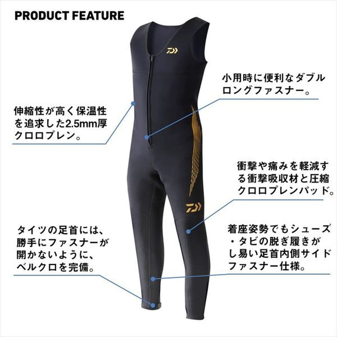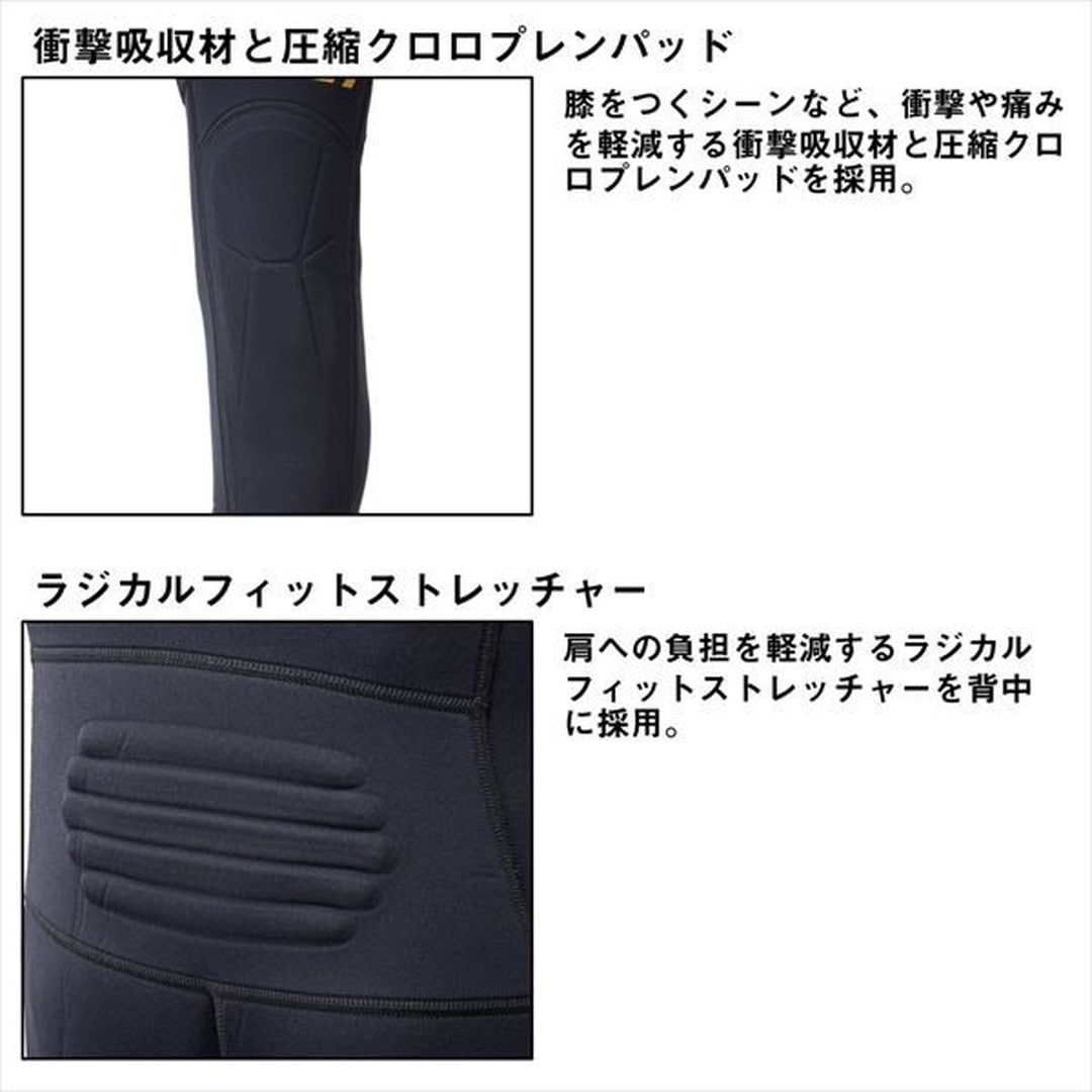 タイツのずり落ちから解放 ロングタイツが新たにラインナップ。肩まで繋がっている、ずり落ちないロングタイツ新登場。立ちこんだ際など、肩まで体にフィットすることで身体が安定する。伸縮性が高く保温性を追求した2.5mm厚クロロプレン。衝撃吸収材と圧縮クロロプレンを膝パッドに採用。膝の可動を邪魔しないデザインになっており、おとり交換の際にも安心して膝をつけられる。着座姿勢でもシューズ・タビの脱ぎ履きがし易い足首内側サイドファスナー仕様。タイツの足首には、勝手にファスナーが開かないようにベルクロを完備。肩への負担を軽減するラジカルフィットストレッチャーを背中に採用。小用時に便利なダブルロングファスナー。