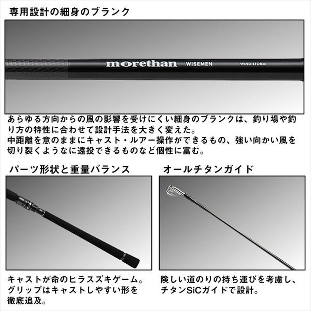 ヒラスズキゲームの可能性をさらに広げるベイトロッド。■110M/MHB(WIND STORM BAIT)・・・ベイトリールと相性の良い荷重移動がスムーズなブランクに設計。キャストは風をもろともせずに低弾道でピンポイントを撃ち抜くのはもちろん、ピンポイントにルアーをそっと置いてくるようなキャストも自在に操る。ファイトにおいては、ロッドの強い粘りとベイトリールならではの巻きパワーで、ランカーヒラスズキや青物を瞬時に浮かせる。
