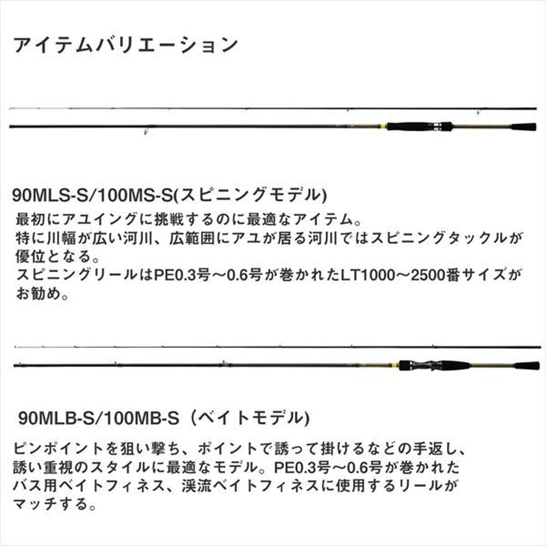 これから「AYUING(アユイング)」に挑戦する方に最適な「AYUING(アユイング)」専用ロッド!■100MB-S・・・一筋先の流れにルアーを安定させ、アユの縄張り内にルアーを行き来させて誘って掛けるのに最適なアイテム。立ち込みにくい流れの強い河川でのアユイングにおいて特にその効果を発揮する。