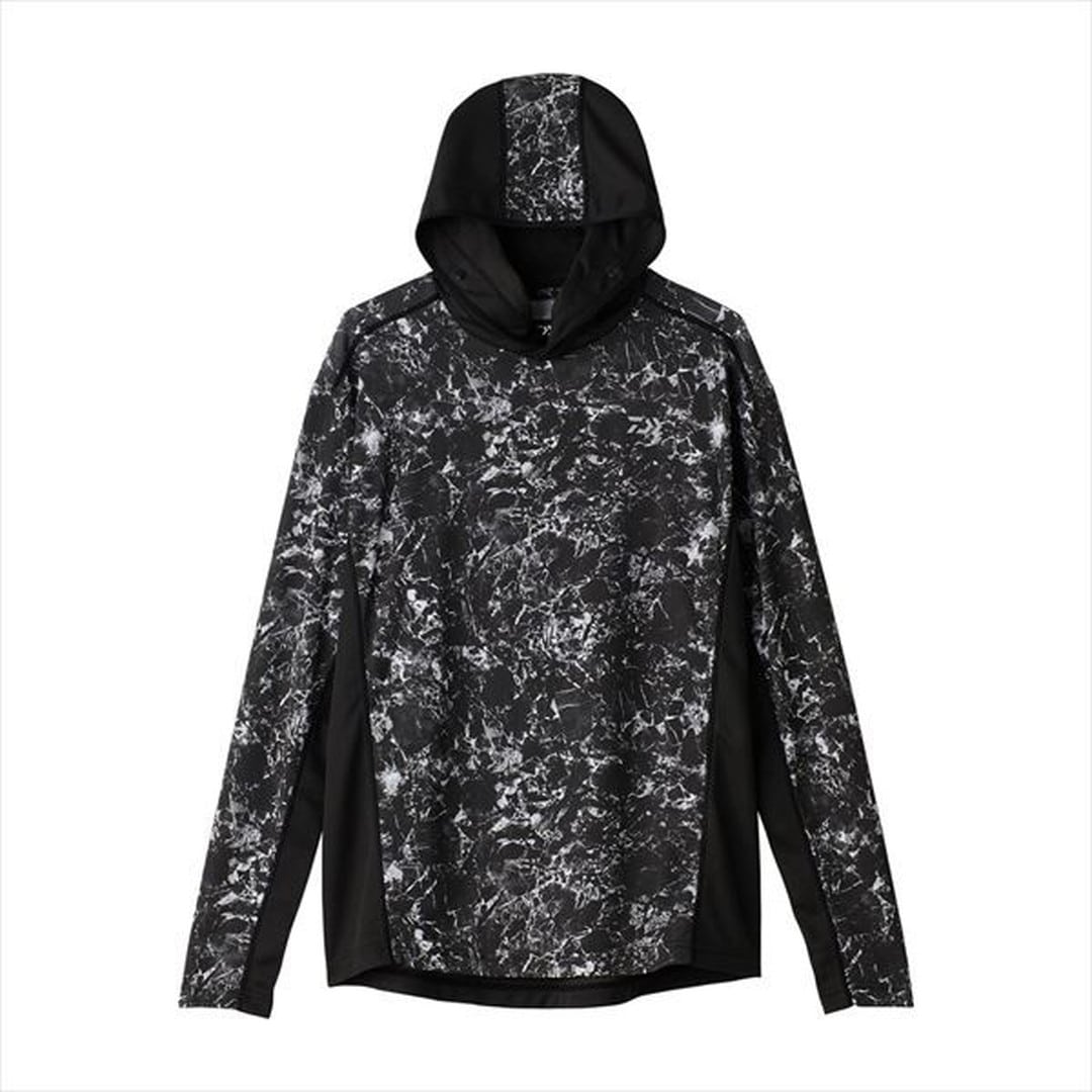 通気性に特化した真夏の定番シャツ。猛暑や湿気などが与える身体へのダメージを極力低減させるために、前身頃と袖部には、ストレッチ性・UVケア・吸水速乾性のある生地を採用。フード首部、後身頃、脇下は、風通しの良いメッシュで切り替えている。フード口部分は、キャップ着用時もしっかり耳までカバーできるよう、高い位置で固定できるドットボタンを搭載しボートの移動時などもキャップをしっかりと抑えておける釣り専用設計。
