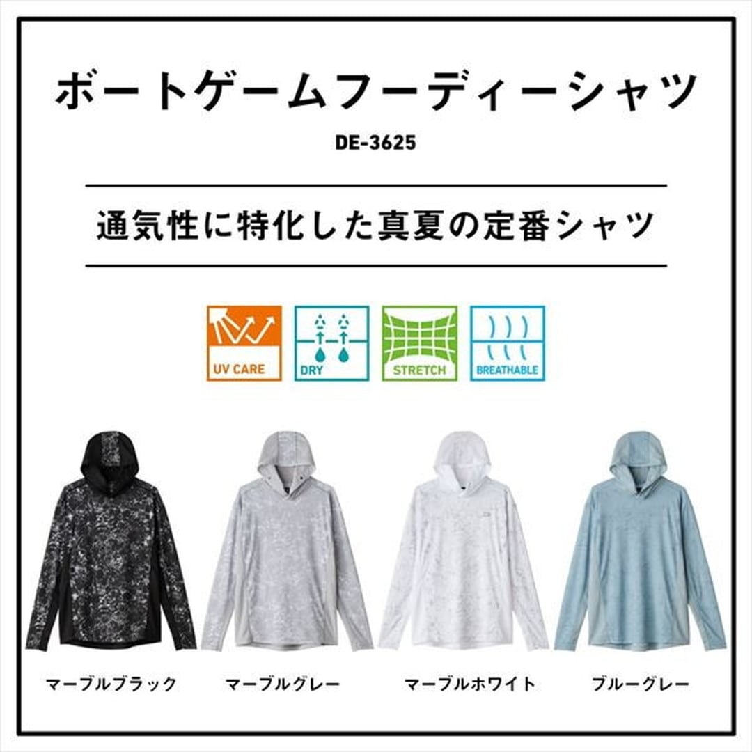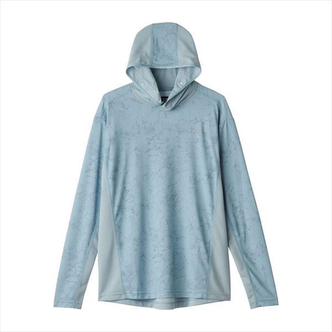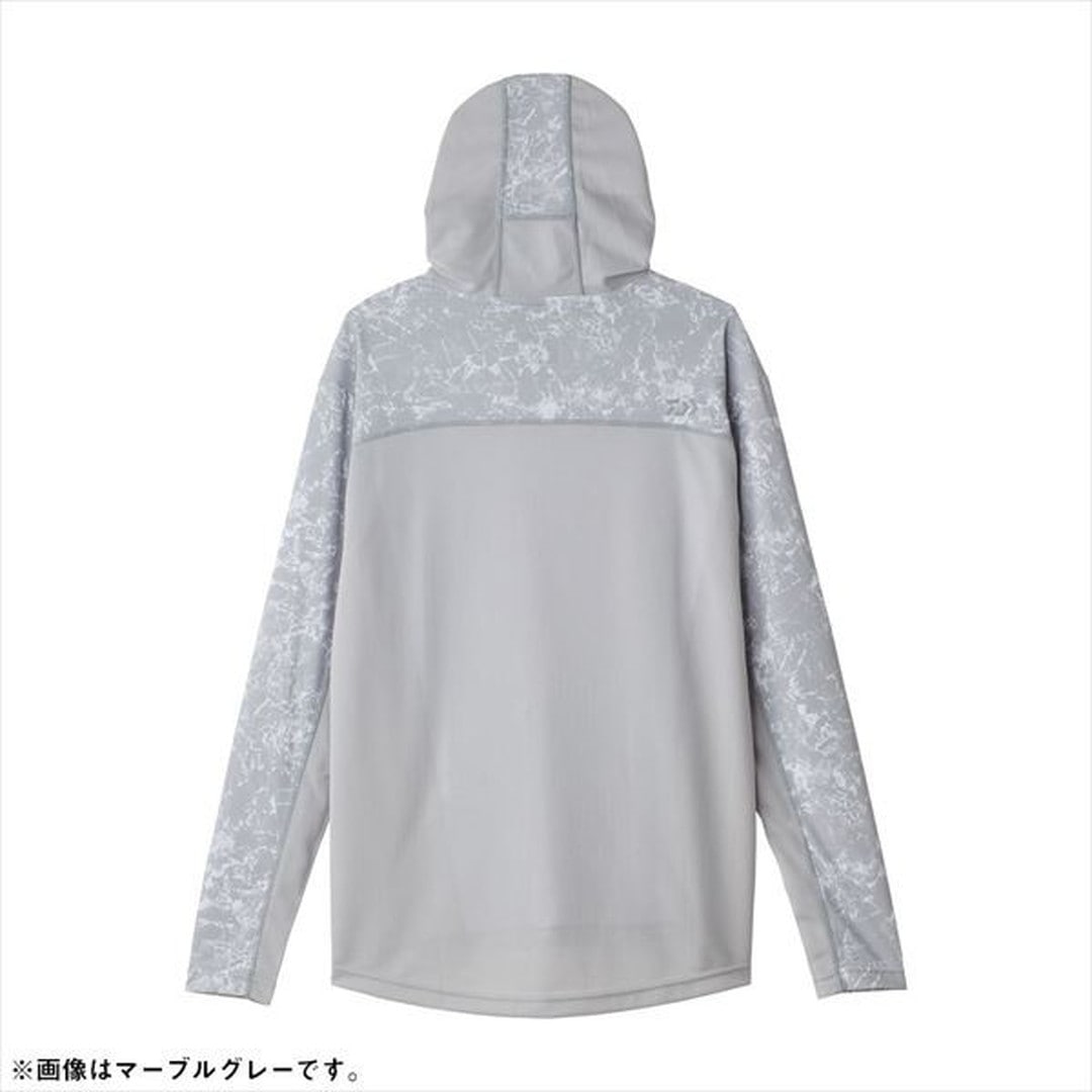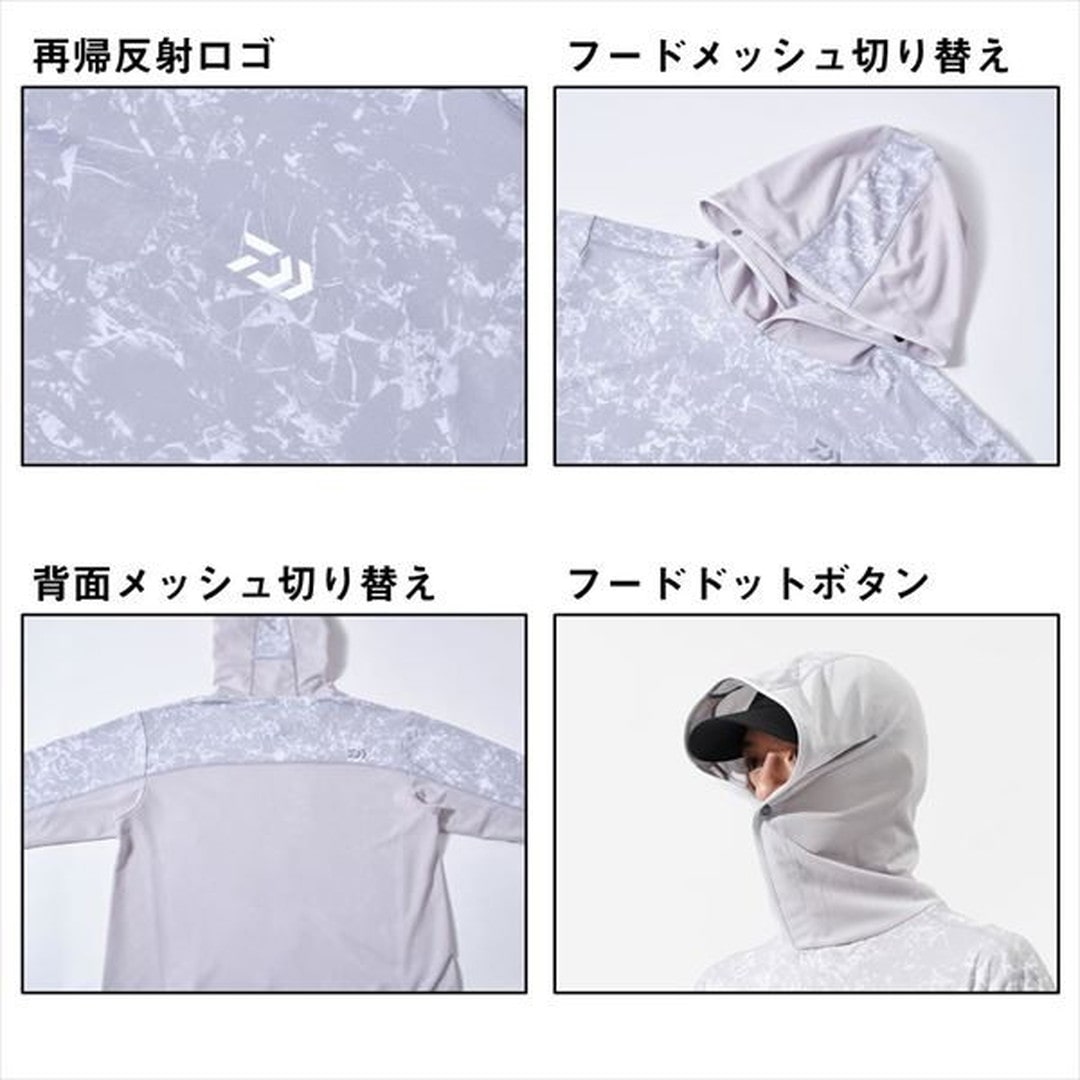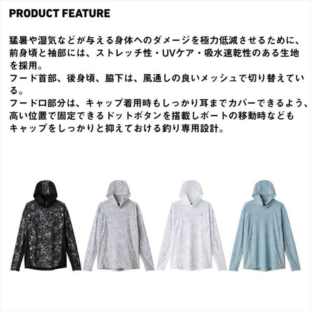 通気性に特化した真夏の定番シャツ。猛暑や湿気などが与える身体へのダメージを極力低減させるために、前身頃と袖部には、ストレッチ性・UVケア・吸水速乾性のある生地を採用。フード首部、後身頃、脇下は、風通しの良いメッシュで切り替えている。フード口部分は、キャップ着用時もしっかり耳までカバーできるよう、高い位置で固定できるドットボタンを搭載しボートの移動時などもキャップをしっかりと抑えておける釣り専用設計。