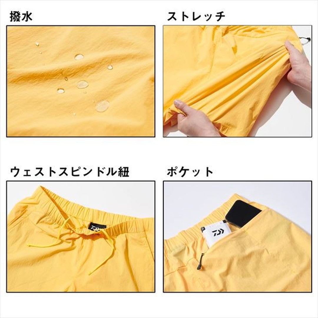 様々なシーンで活躍する定番撥水ショートパンツ。ドライタッチで汗をかいてもべた付きにくく、適度なストレッチ性で動きやすい素材を採用。撥水加工を施し、多少の水がかかるシーンでも使用可能。ウエストはスピンドル紐仕様。背面のファスナー付きポケットは仕切りがあり、携帯や小物の仕分けにも便利。