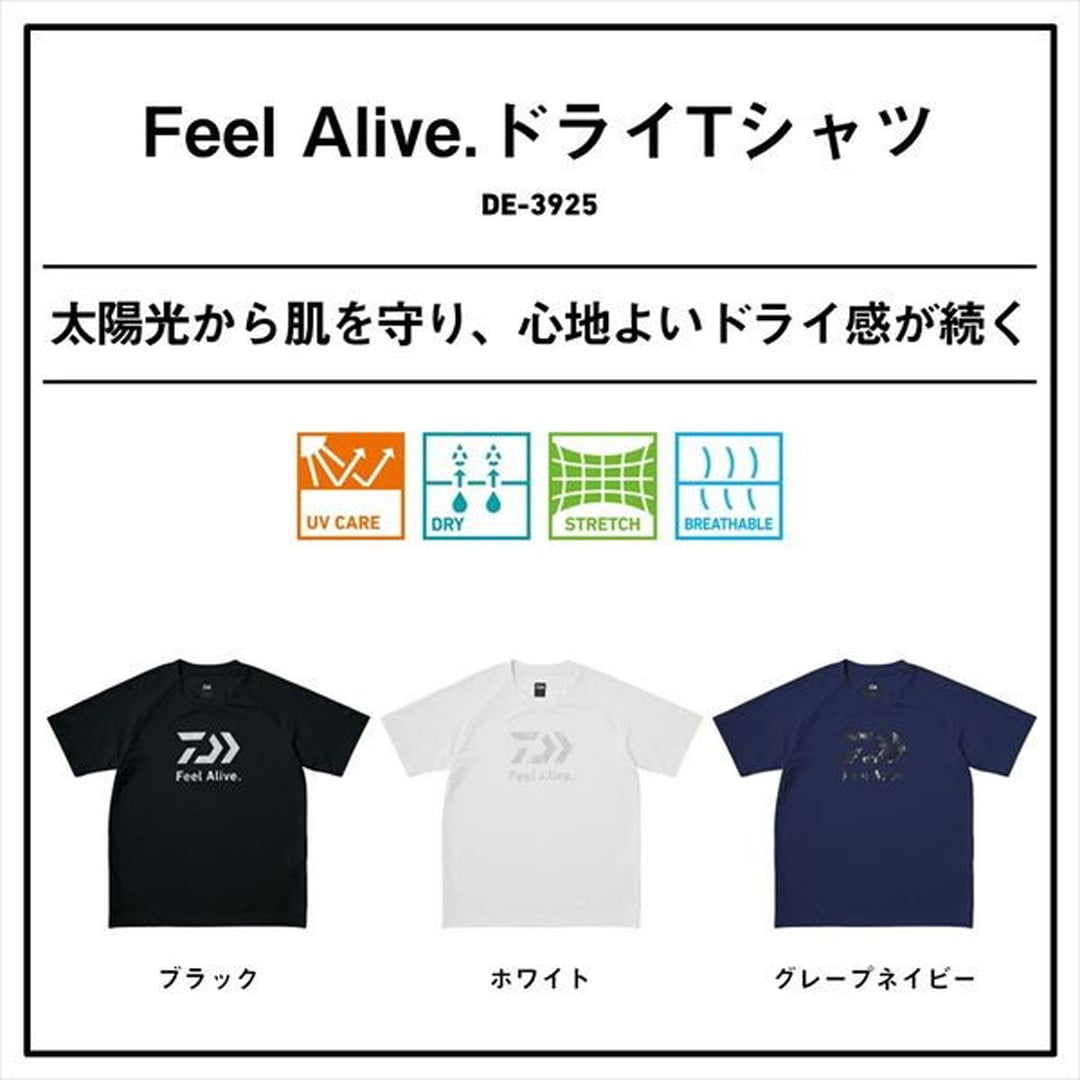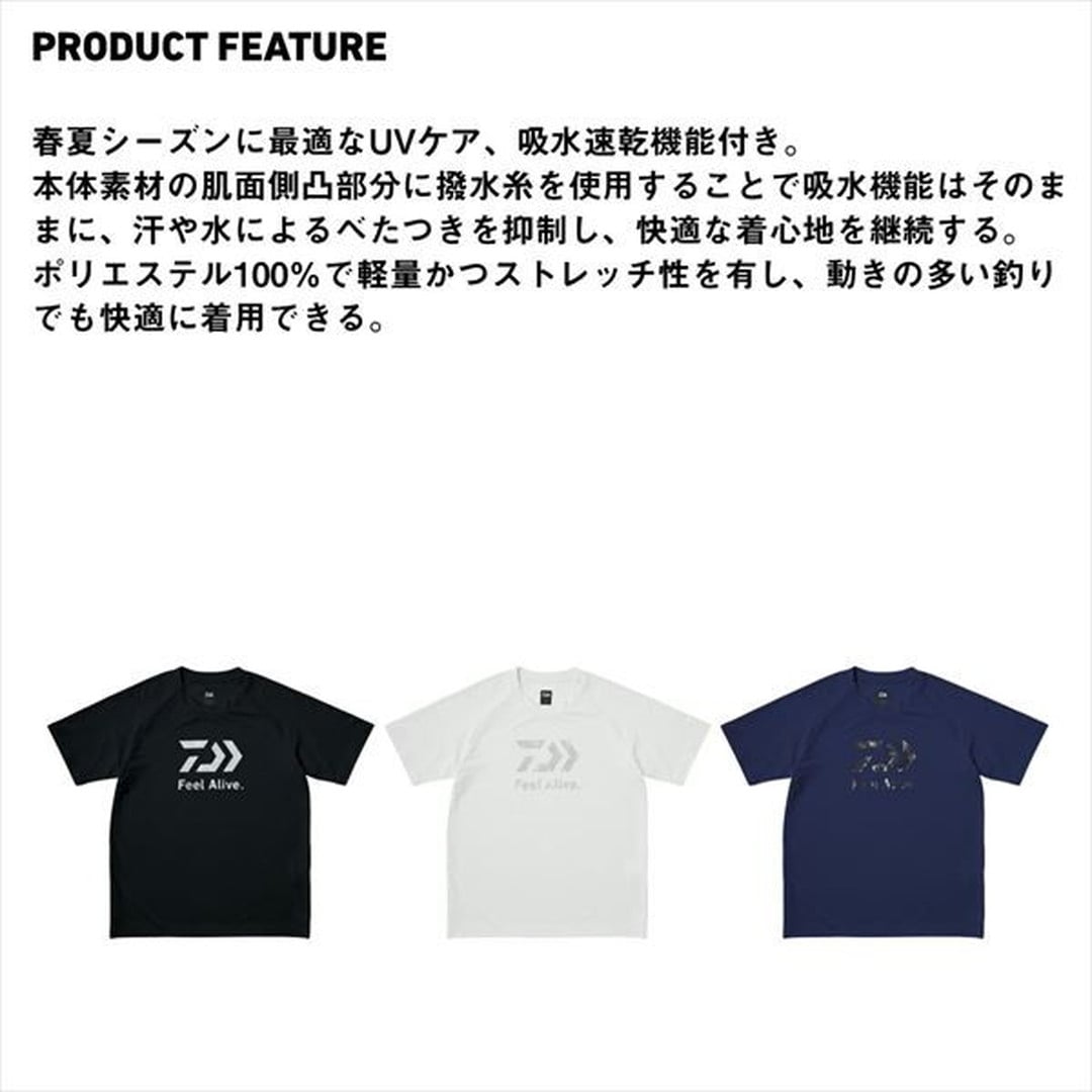 太陽光から肌を守り、心地よいドライ感が続く。春夏シーズンに最適なUVケア、吸水速乾機能付き。本体素材の肌面側凸部分に撥水糸を使用することで吸水機能はそのままに、汗や水によるべたつきを抑制し、快適な着心地を継続する。ポリエステル100%で軽量かつストレッチ性を有し、動きの多い釣りでも快適に着用できる。