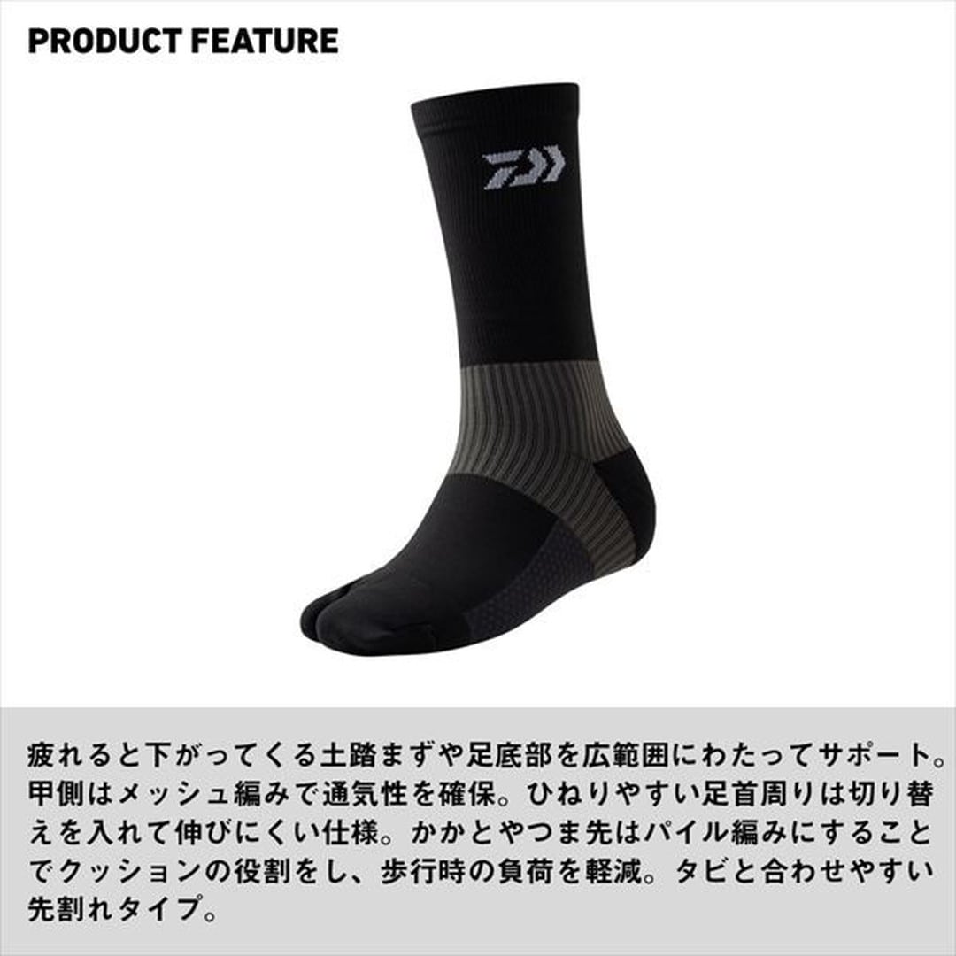 足底を押し上げ動きやすい快適設計。疲れると下がってくる土踏まずや足底部を広範囲にわたってサポート。甲側はメッシュ編みで通気性を確保。かかとやつま先はパイル編みにすることでクッションの役割をし、歩行時の負荷を軽減。タビと合わせやすい先割れタイプ。