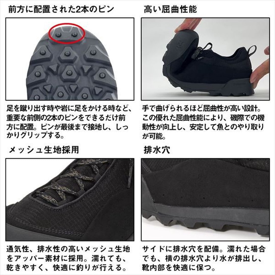 瀬川良太監修モデル。ロックショアフィッシングに必要な機能性を徹底的に追求したTGロックショアシューズ。◆TGスパイクソール。新たに足の屈曲位置を基に設計されており、従来のスパイクソールよりも屈曲性能が高い。歩行時のピンの接地面積が増え、ファイトシーンやランディングシーンでも安定して釣りが行える。◆悪い足場の磯で最も重要なグリップ性能を向上させるため、タングステンピンを採用。タングステンは従来のステンレスピンよりも高い硬度を持ち、しっかりと 磯にグリップする。また、ピンの土台を従来のステンレスピンの約1.5倍に拡大し、突き上げ感も軽減。◆アッパーには乾きやすく通気性の高いメッシュ素材を使用 ◆インソールにはノンスリップ仕様の乾きやすいインソールを採用し、靴内部での足のずれを防ぐ。斜面の磯でも驚くほど歩きやすい。◆本体とアウトソールの間に新型のEVAミッドソールを採用し、履き心地を向上。長時間釣行の疲れを軽減。