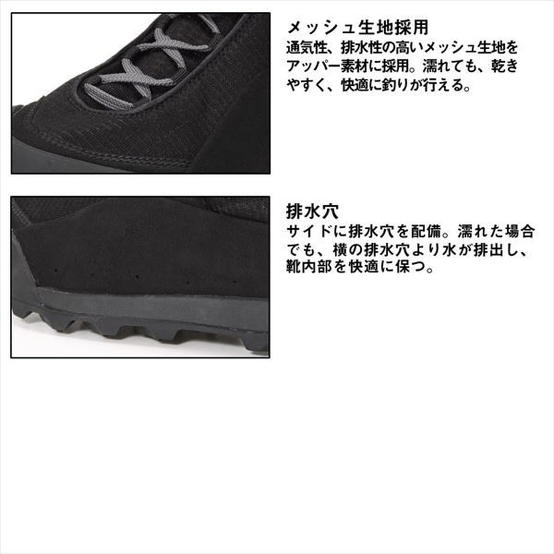 瀬川良太監修モデル。ロックショアフィッシングに必要な機能性を追求したTGロックショアシューズ。悪い足場の磯で最も重要なグリップ性能を向上させるため、タングステンピンを採用。従来のステンレスピンよりも高い硬度を持ち、しっかりと磯にグリップする。また、ピンの土台を従来のピンの約1.5倍に拡大し、突き上げ感も軽減。今回のTGスパイクフェルトソールは、フェルトにピンを固定するのではなく、アウトソールのゴムにピンを固定する方式。この設計により、ピンのぐらつきを減らし、地面に対して常にピンが立った状態をキープ。ピンの性能が最大限に発揮され、グリップ力が向上した。アッパーには乾きやすく通気性の高いメッシュ素材を使用。サイドには排水穴を配備しており、靴内部が濡れても水をしっかり排出する。インソールにはノンスリップ仕様の乾きやすいインソールを採用。靴内部での足のずれを防ぎ、斜面の磯でも驚くほど歩きやすくなった。本体とアウトソールの間に新型のEVAミッドソールを採用し、履き心地を向上。長時間釣行の疲れを軽減する。