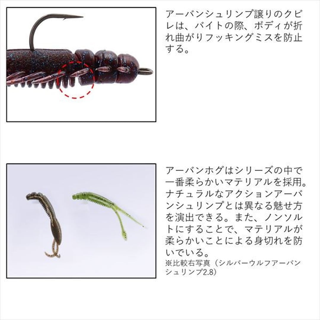 緩急自在のナチュラルな水押しと存在感でアピールするオールラウンダー!全国でブームを引き起こしている、フリリグチニングゲームの第一人者、森浩平テスター(通称:もりぞー)監修ワームの第3弾。低活性字のスローな展開を得意とするアーバンシュリンプに対し、アーバンホグは、よりボリュームが欲しい春の時期やアピールは最小限にテンポよく釣りを行う展開に有効。ナチュラルな水押しと存在感でアピールする。爪の形もチニング専用設計。爪をウチワ形にせず、後端を絞ったデザインを採用。ボリュームは確保しつつ空位抵抗を減らすことで飛距離と操作性が向上し、ホグ独特の飛距離不足や操作感のダルさを解消している。