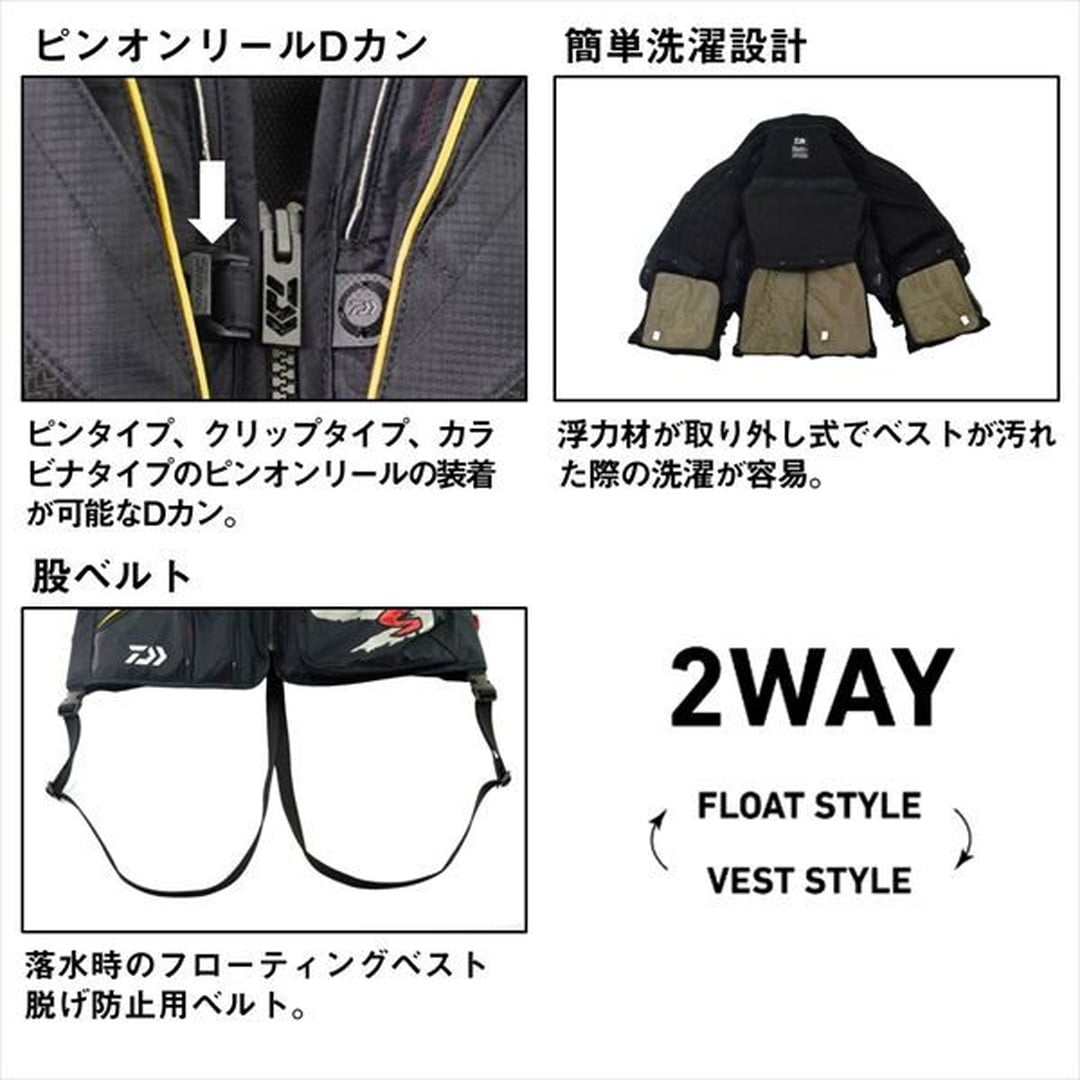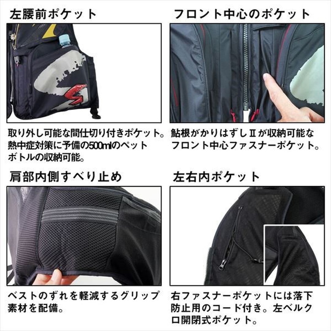 SPECIALベストの機能に浮力性を持たせたアイテム。アユ釣りにもフローティングベストの機能をプラスし安全第一で釣りを楽しんでもらうため開発。5.85Kg/24時間以上の浮力性能があり、ベストのずり上がり防止の股ベルト標準装備。浮力材は取り外し可能。フィールドに合わせて通常仕様/浮力材入り仕様の2WAY仕様。