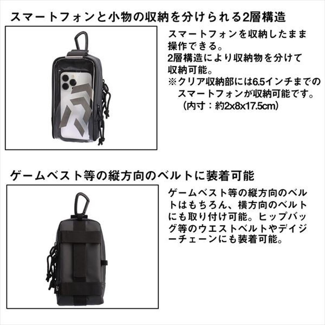 スマートフォンを収納したまま操作・通話・撮影が可能!スマートフォンと小物の収納を分けられる2層構造。クリア収納部には6.5インチまでのスマートフォンが収納可能。(内寸:約2×8×17.5cm)カラビナと背面の面ファスナーは横向きでの使用も可能。動画撮影時に便利。縦方向、横方向のベルトに装着可能。さまざまな場所に取り付け可能なカラビナ付き。収納物が取り出しやすい開口構造。本体内部にスリットポケット付き。暗闇で光を反射するリフレクター付き