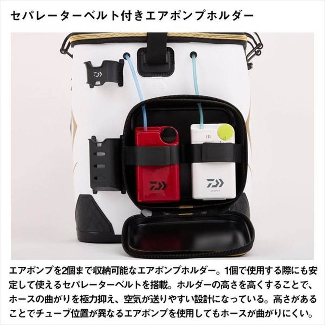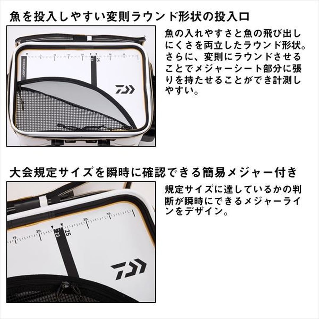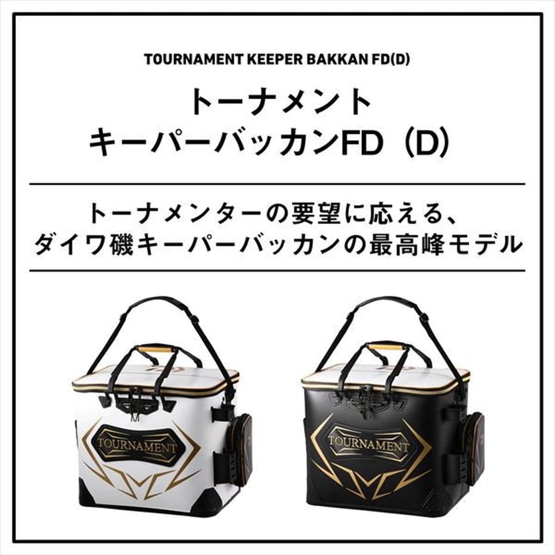トーナメンターの要望に応える、ダイワ磯キーパーバッカンの最高峰モデル!魚を投入しやすい変則ラウンド形状の投入口。大会規定サイズを瞬時に確認できる簡易メジャー付き。空気が送りやすく魚をより長く活かせるエアポンプホルダー。チームシールや名前シールが貼りやすくはがれにくい特殊表面加工のネームスペース。その他細部までこだわった機能が満載のトーナメントキーパーバッカンFD(D)。