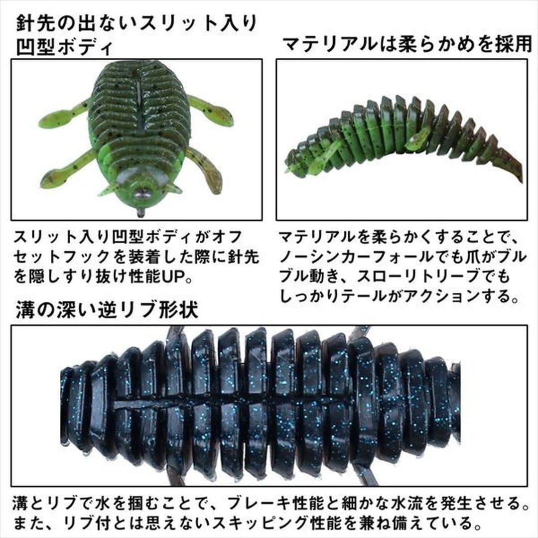 オカッパリ基準のアングラーが求めるものを凝縮した複雑波動系ワーム!●オカッパリを基準に考えた場所を選ばないシャッドテールワーム ●面倒臭いリグ不要。ノーシンカーリグ、テキサスリグ、フリーリグがオススメ!●特殊形状リブ、4対の爪、シャッドテールが複雑な水流を生み出し魚にアピール!●スローリトリーブに対応したテール搭載。●STEEZスターリングシャッドゆずりの凹型ボディ形状で、すり抜け性能と低重心化を実現