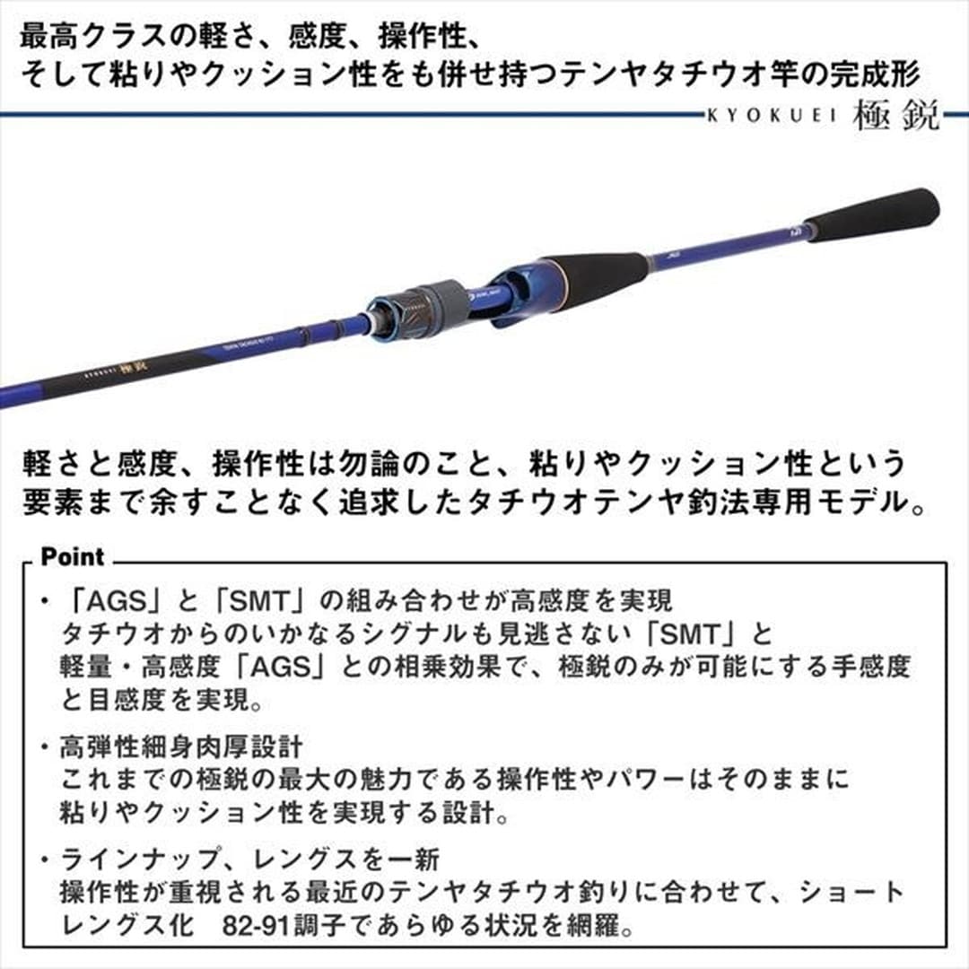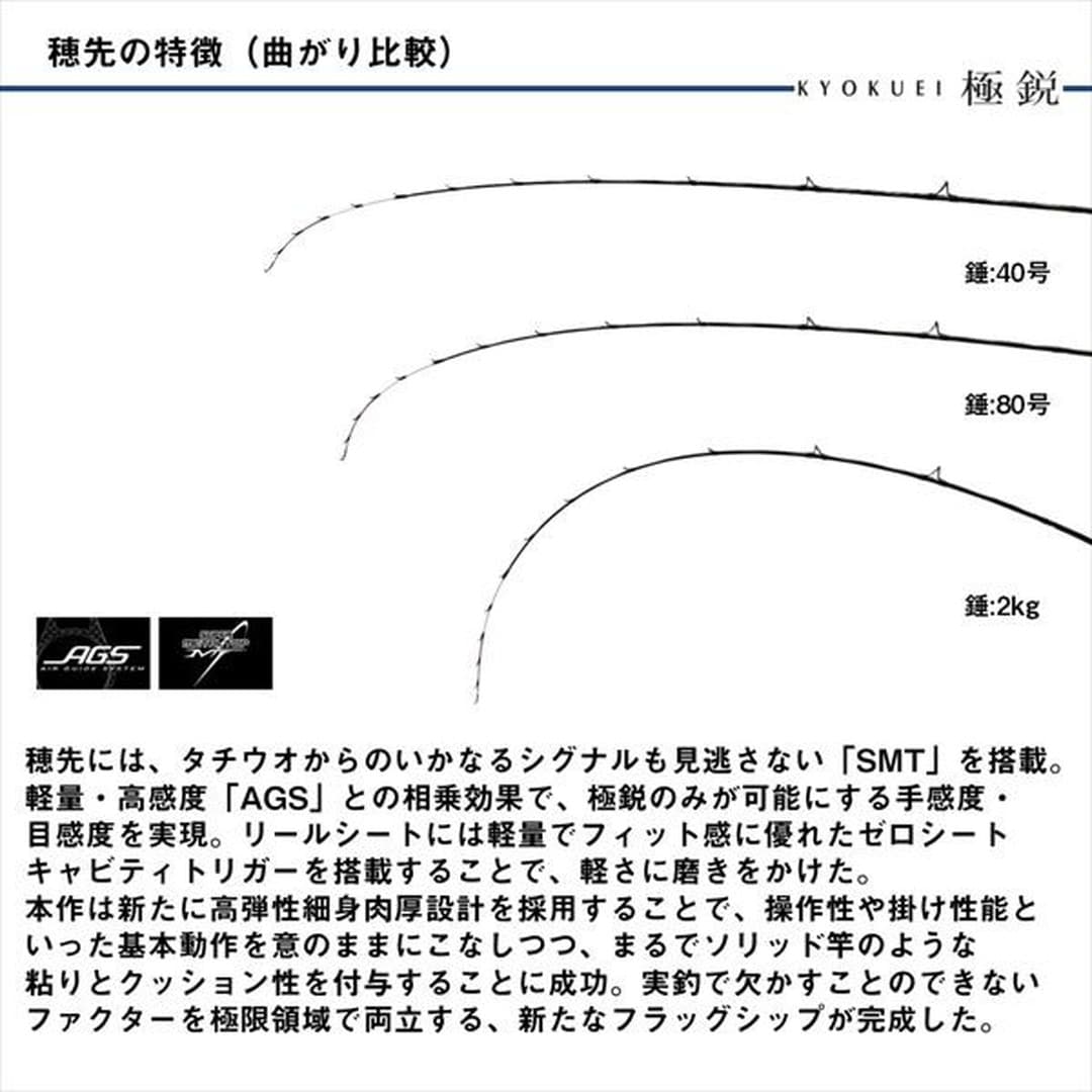 軽さ、感度、操作性、そして粘りやクッション性をも併せ持つテンヤタチウオ竿の完成形。穂先には、タチウオからのいかなるシグナルも見逃さない「SMT」を搭載。軽量・高感度「AGS」との相乗効果で、極鋭のみが可能にする手感度・目感度を実現。リールシートには軽量でフィット感に優れたゼロシートキャビティトリガーを搭載することで、軽さに磨きをかけた。本作は新たに高弾性細身肉厚設計を採用することで、操作性や掛け性能といった基本動作を意のままにこなしつつ、まるでソリッド竿のような粘りとクッション性を付与することに成功。実釣で欠かすことのできないファクターを極限領域で両立する、新たなフラッグシップが完成した。■82S-180・・・タチウオに深く追わせる食い込み性能を追及した8:2S(ソフト)調子。そのしなやかさからドラゴンと呼ばれる大型サイズとのファイトにも最適。
