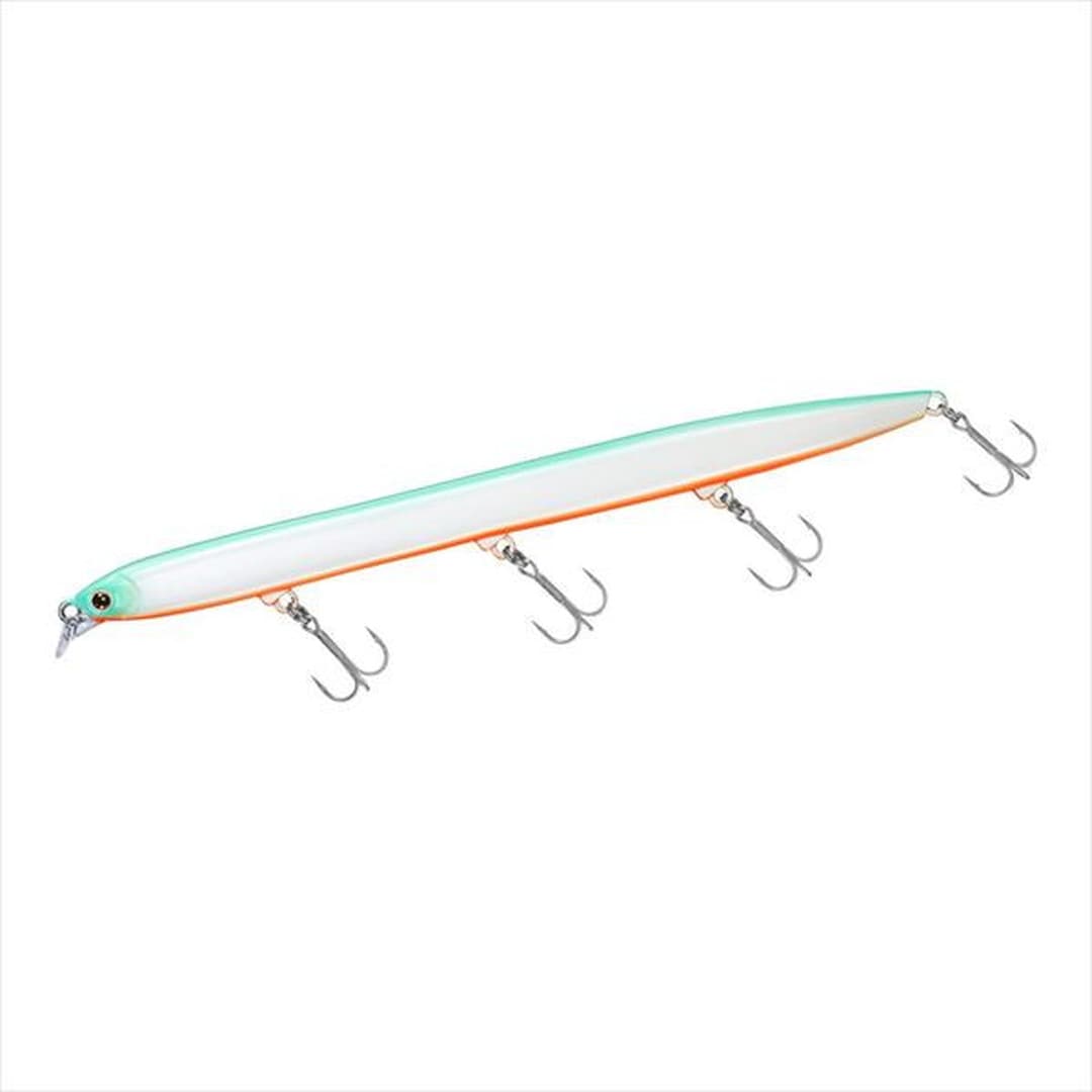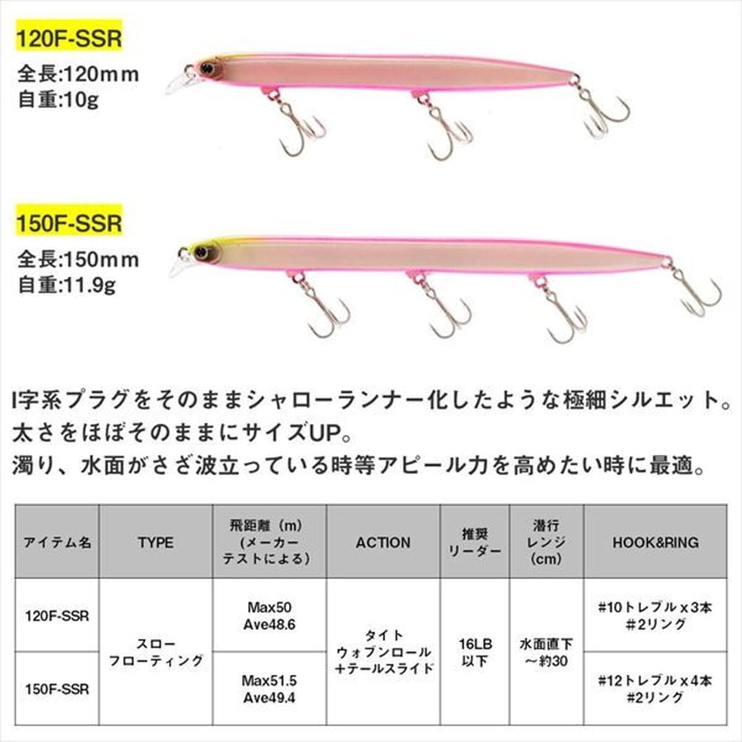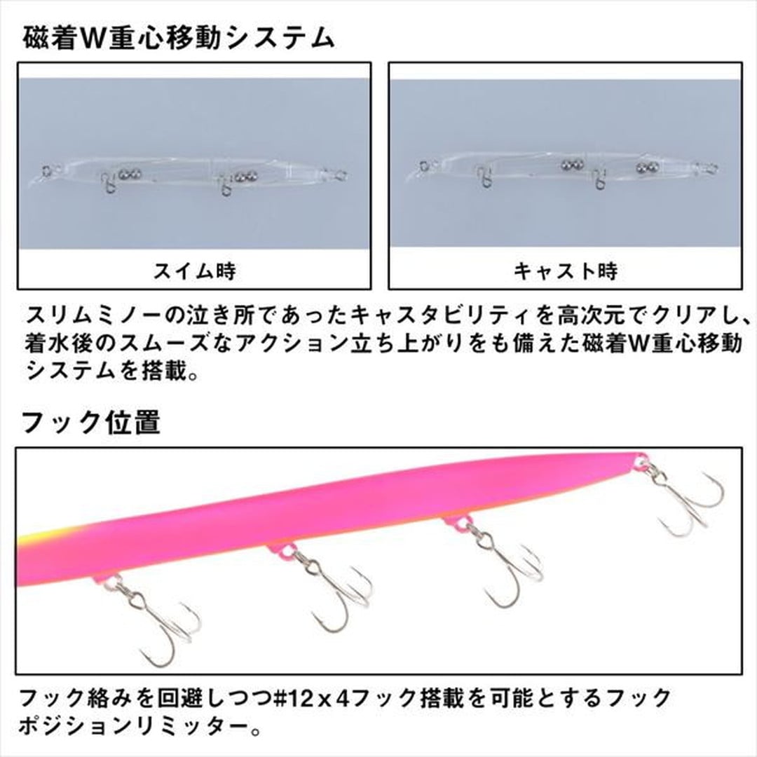 小沼正弥監修。密かに爆れ。バチ、サヨリ、シラス、激スレパターン対応、極細シルエットの水面直下攻略型ぶっ飛びシャローランナー。細身・小型ベイトに偏食している時、激スレ時に最適。バチ、サヨリ、シラスはもとより、イワシや稚アユ等の小型ベイトパターンにベストマッチな極スリムシルエット。高レスポンス&スレに強いタイトウォブンロール+テールスライドアクションで、低速~高速まで全てのリトリーブに対応。ロッドポジションとリトリーブ速度の組み合わせで水面直下~約30cmが有効レンジ。風雨等でI字系スリムプラグが太刀打ちできない状況でも、一枚下のレンジでしっかりアピールできる。極細ボディながら磁着重心移動を前後にダブルで搭載し、「スリムミノーは飛ばない」イメージをくつがえす快適なキャスタビリティと立ち上がり性能を両立。
