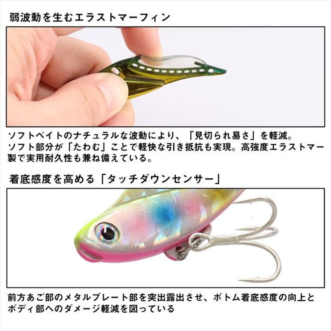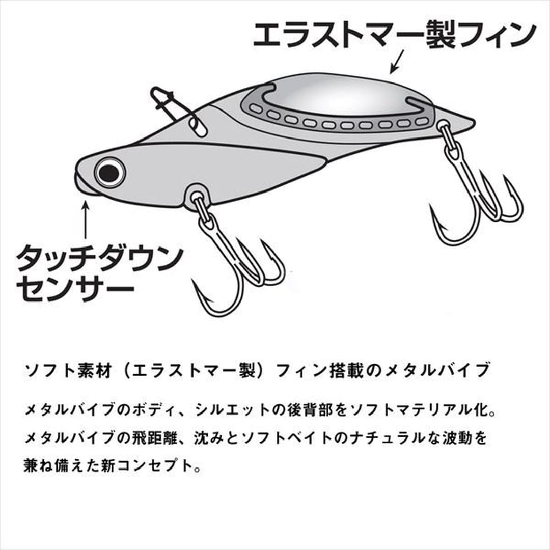 こんなテッパン見たこと無い!新発想「メタルバイブ×ソフトベイト」がコンセプト。ナチュラル波動を発するハイブリッド鉄板バイブ。エラストマーフィン(背びれ)搭載のメタルバイブ(PAT.P)。メタルバイブの飛距離、沈み、感度とソフトベイトのナチュラルな波動を兼ね備えた新コンセプト。ナチュラルな水切り波動で「見切られ易さ」を軽減。メタルバイブの重い引き抵抗を、背中のソフトベイト部分が「たわむ」ことで軽減。潮流抵抗もよりわかり易い。あご部分に本体鉄板部をむき出しにすることで、着底感度を向上。ソフトベイト部分はクリアー仕上げで背ビレをイメージ。ナチュラル且つコンパクトに見せることができる。スナップの取り外しがし易い楕円スイベルアイ。山内勝己テスター監修。