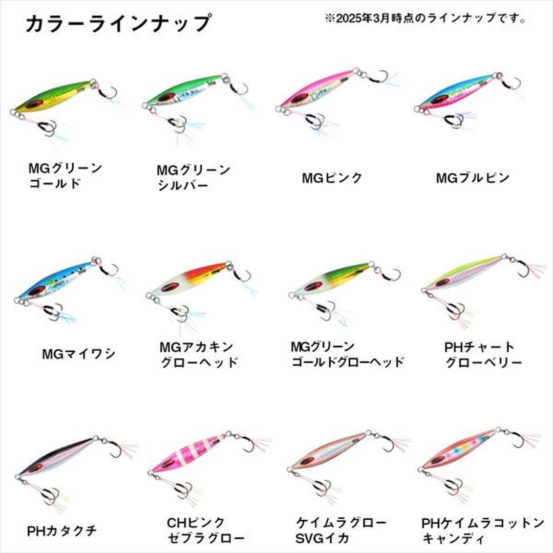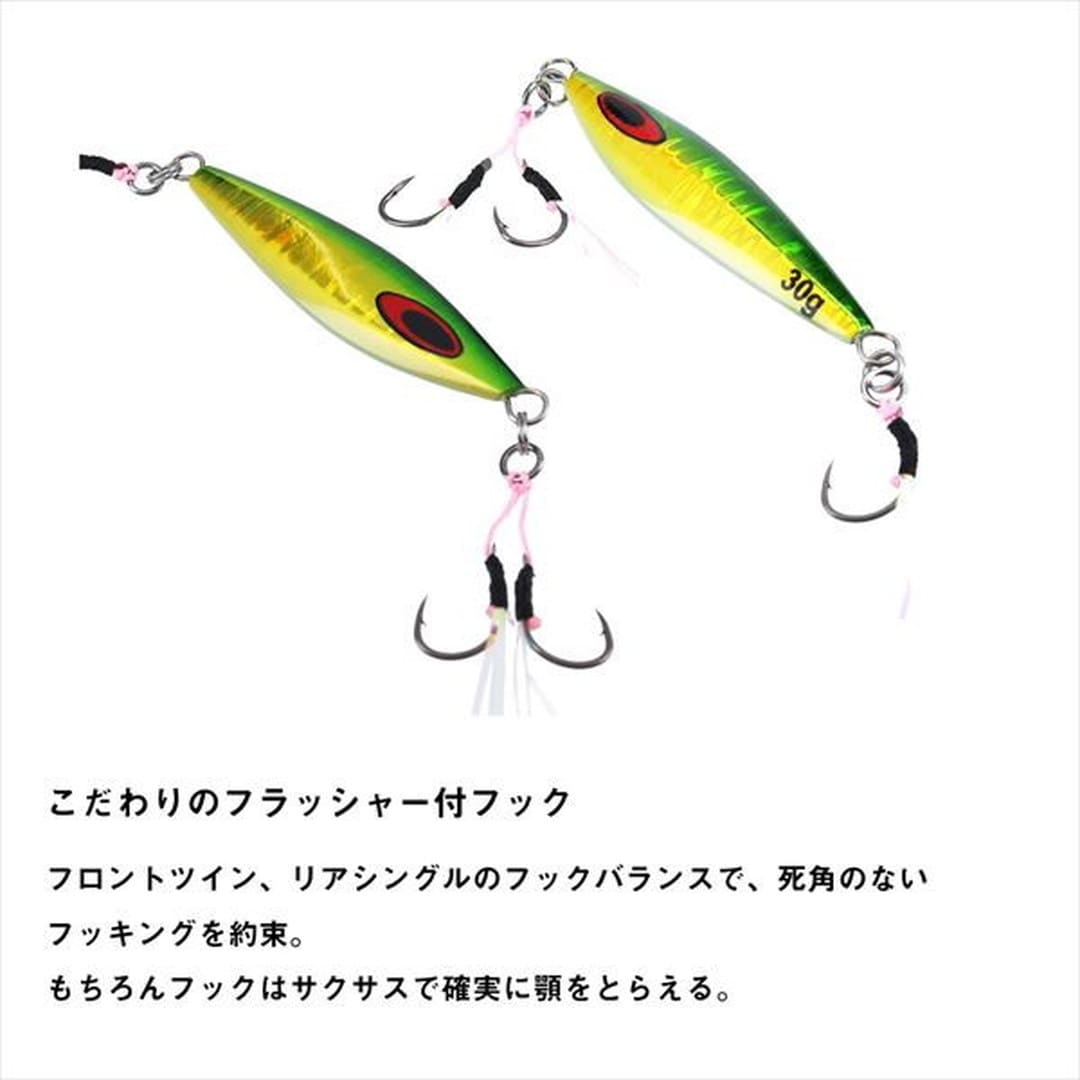 フォールで見せてしっかり食わせる。スーパーライトジギングでもこのコンセプトそのままに専用フック搭載でリリース。スーパーライトジギングシーンでもFKのコンセプトそのままにしっかり見せて食わせるジグとして誕生。プロダクトを作り上げるために住澤テスター、鳴瀬テスター、戸出ダイワスタッフを中心に納得いくまで削りこみ、絶対の自信を持ってリリース。ジグのアクション決定に至っては、一切の妥協なし。ジャーク感、フォールに切り替わるレスポンスの速さ、フォール時のフラッシング性能に至るまで、納得のいくまで削りこみ、ダメにしたジグは数え切れず。この手に残されたミクロの削り幅がこのジグを絶対のモノにしていると自負しています。「とにかく快適。釣れる気しかしない。」と言わしめたSLJのニューフェース。