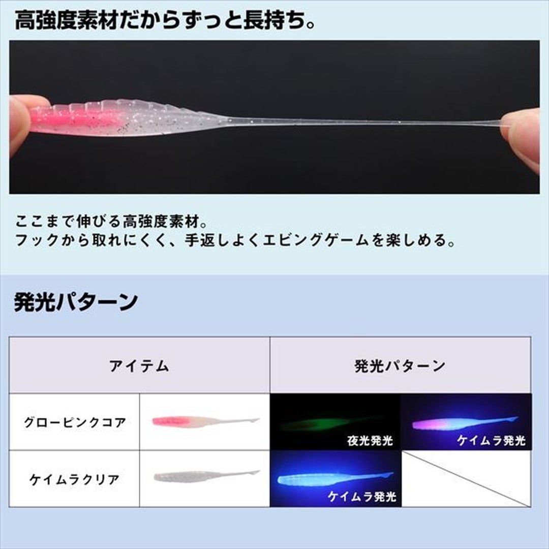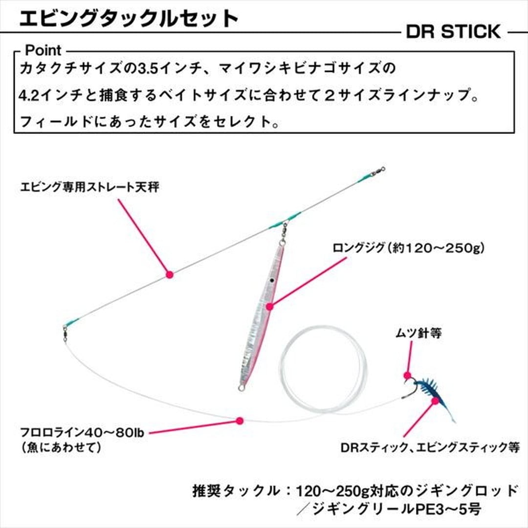 エビングで熱望されていたDRスティックが完全復刻。マグロ、カツオ類のエビングにベストマッチ。デルタテールの微波動が誘う。ソフトで千切れにくい高強度素材採用。