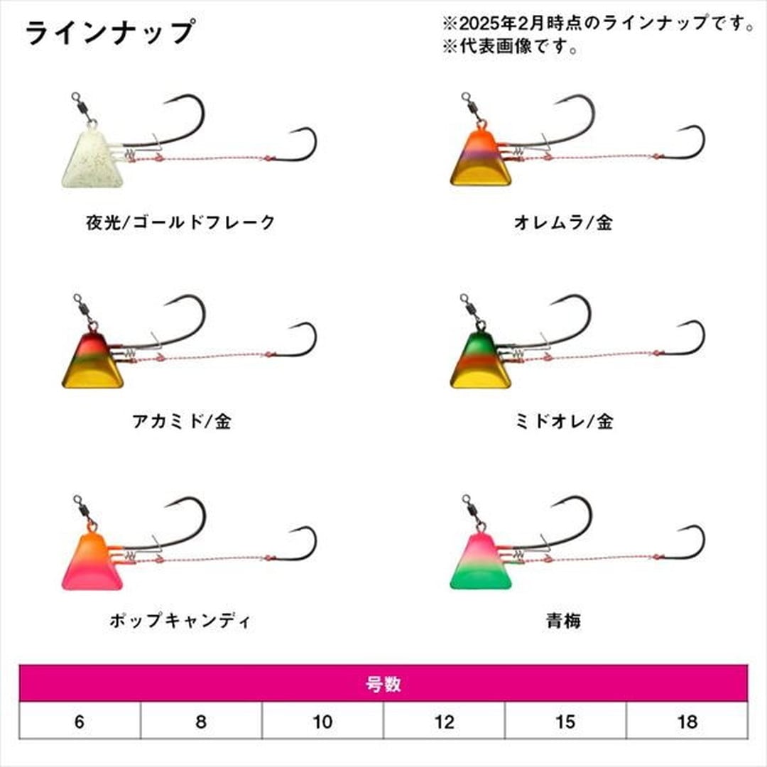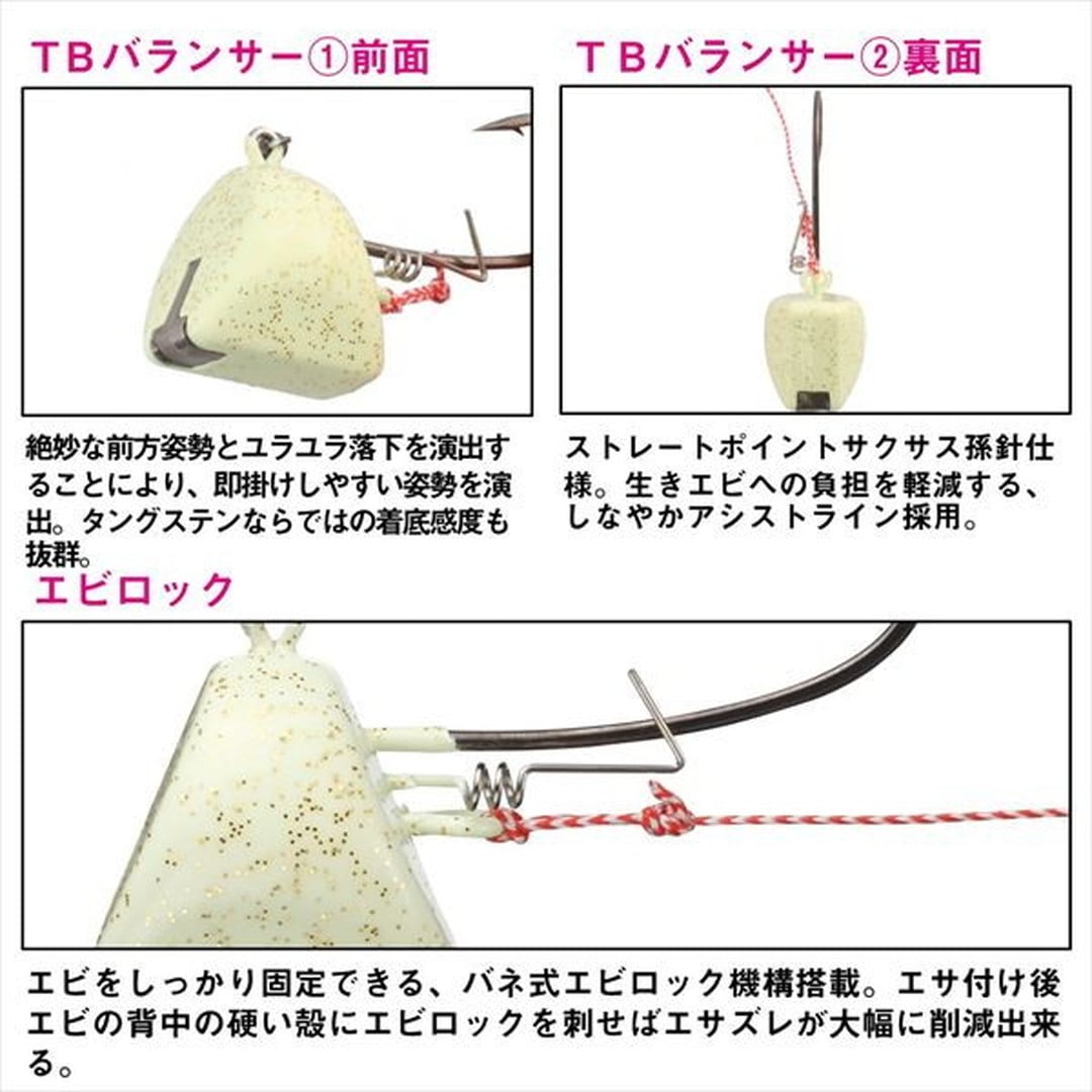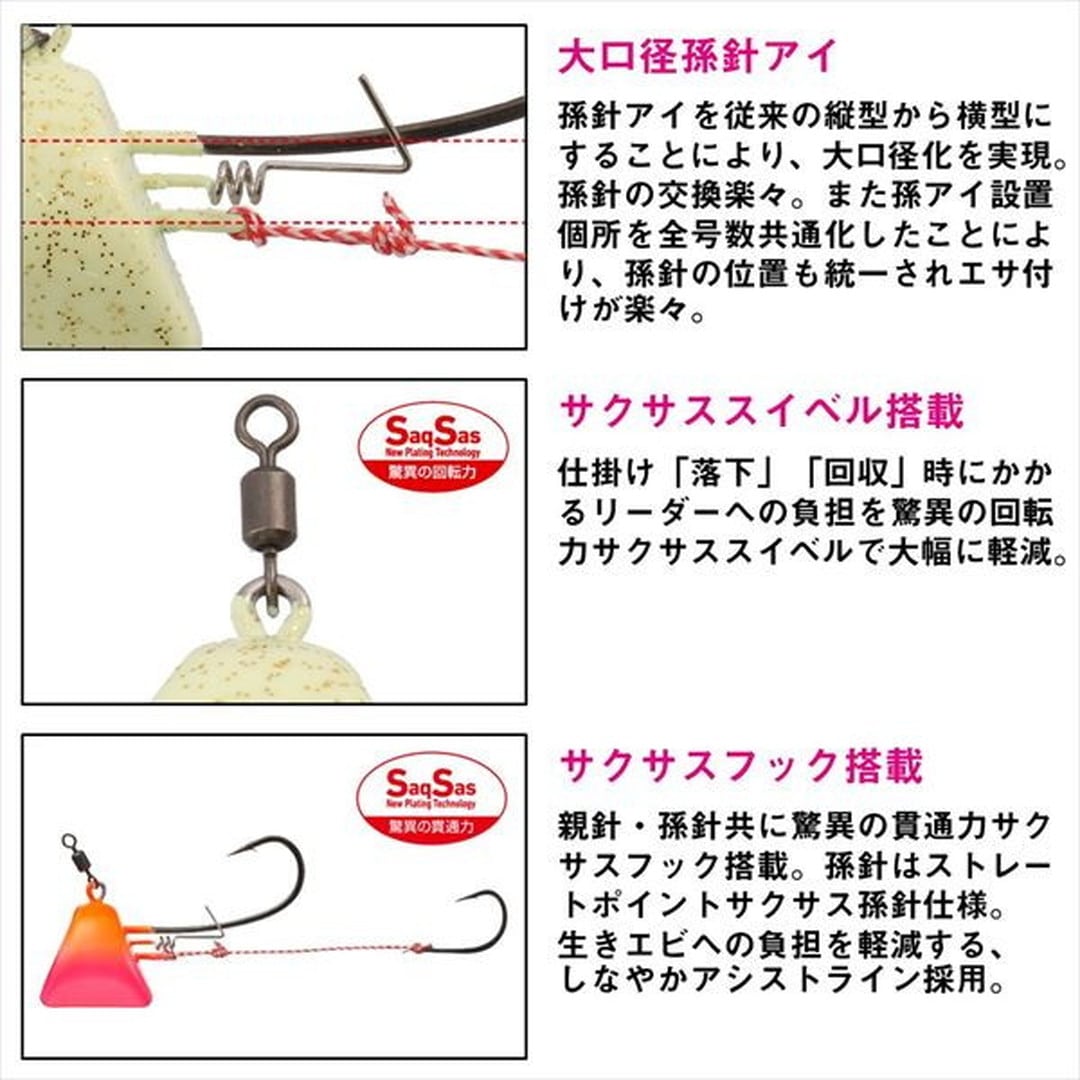 マダイの僅かなアタリを捉えて瞬時に掛ける!リアクション釣法に特化した孫針設計。タイカブラ本体バンパー部にタングステンパーツを埋め込んだ、絶妙な前重心設計・着底感度抜群の次世代タイテンヤ。ストレートポイントサクサス孫針仕様。生きエビへの負担を軽減する、しなやかアシストライン採用。