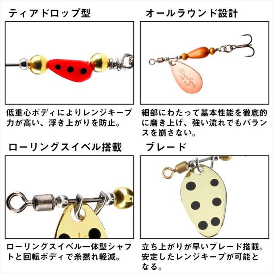 基本性能の徹底。立ち上がりの早い、トラブルレススピナー。スピナーは「投げて巻く」、これだけでとにかく釣れる。シンプルであるがゆえに、ルアーの基本性能は誤魔化しがきかず大切になる。シルバークリークスピナーはこの基本性能を徹底的に見直した。細部にわたって基本性能を徹底的に磨き上げ、強い流れでもバランスを崩さないオールラウンド設計。ローリングスイベル一体型シャフトと中通しの回転するボディにより糸ヨレ軽減。
