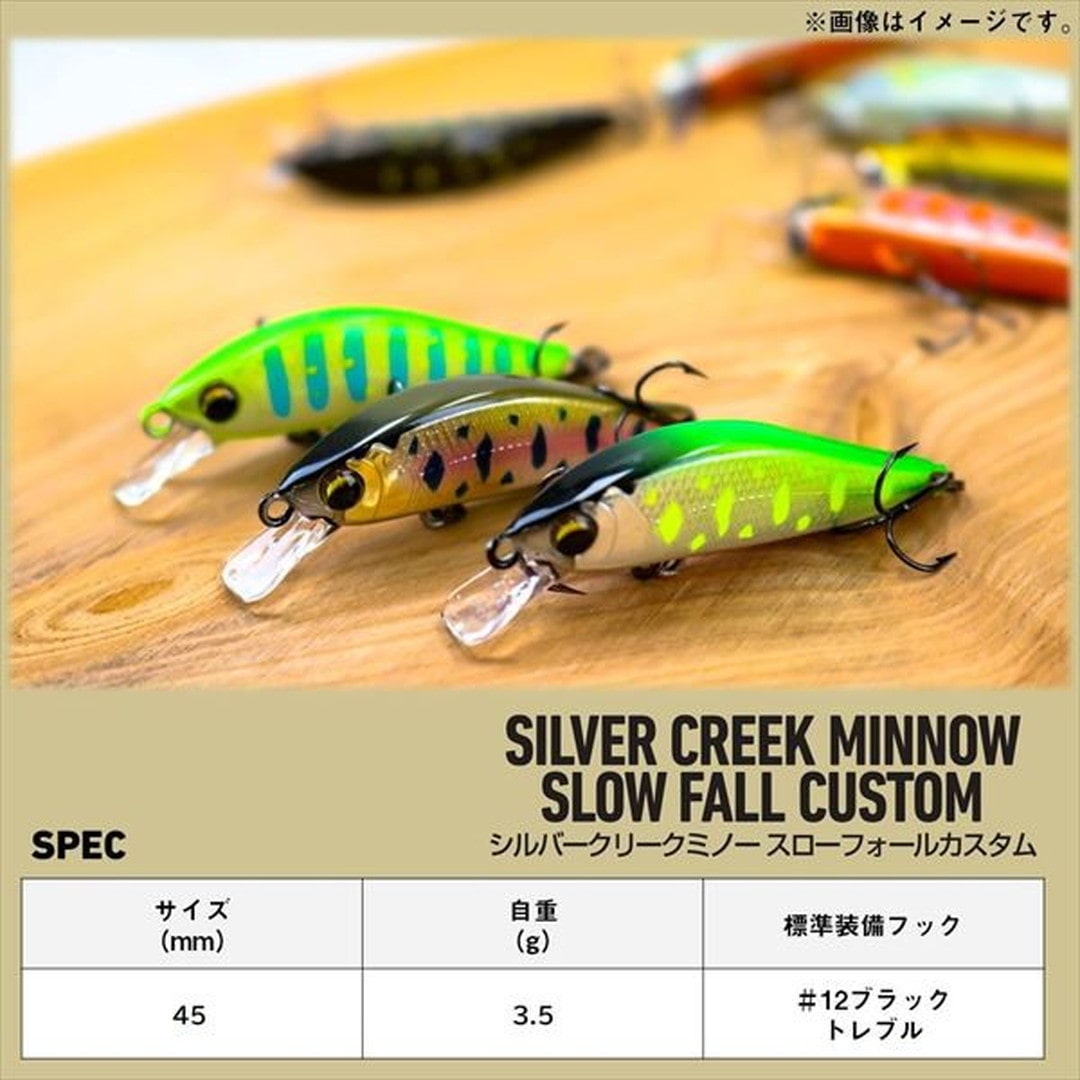 スローフォール設計が生む時間をかけた繊細なアプローチ!シルバークリークミノースローフォールカスタム45SSはゆっくり沈み、時間をかけ誘うことが可能であり、更には水深30cm以内の浅瀬も根掛かりせずに攻略出来る。低水温時やハイプレッシャー時の追いが鈍い魚、浅瀬に定位する魚などに特に効果的である。また、スローフォールカスタムシリーズ特有の細かな首振りアクションをベースに、強めのトゥイッチを入れた際にヒラを打つように設計されている。ゆっくりした動きに追尾した渓魚に対し、瞬間的にスイッチを入れるアクションを入れ、しっかりとバイトへとつなげていく。