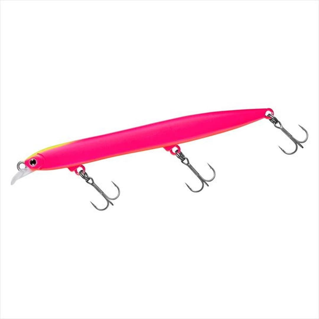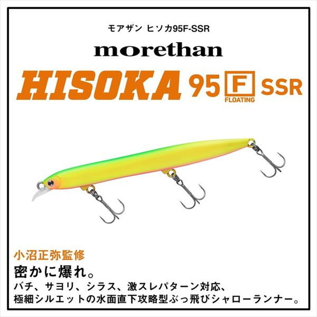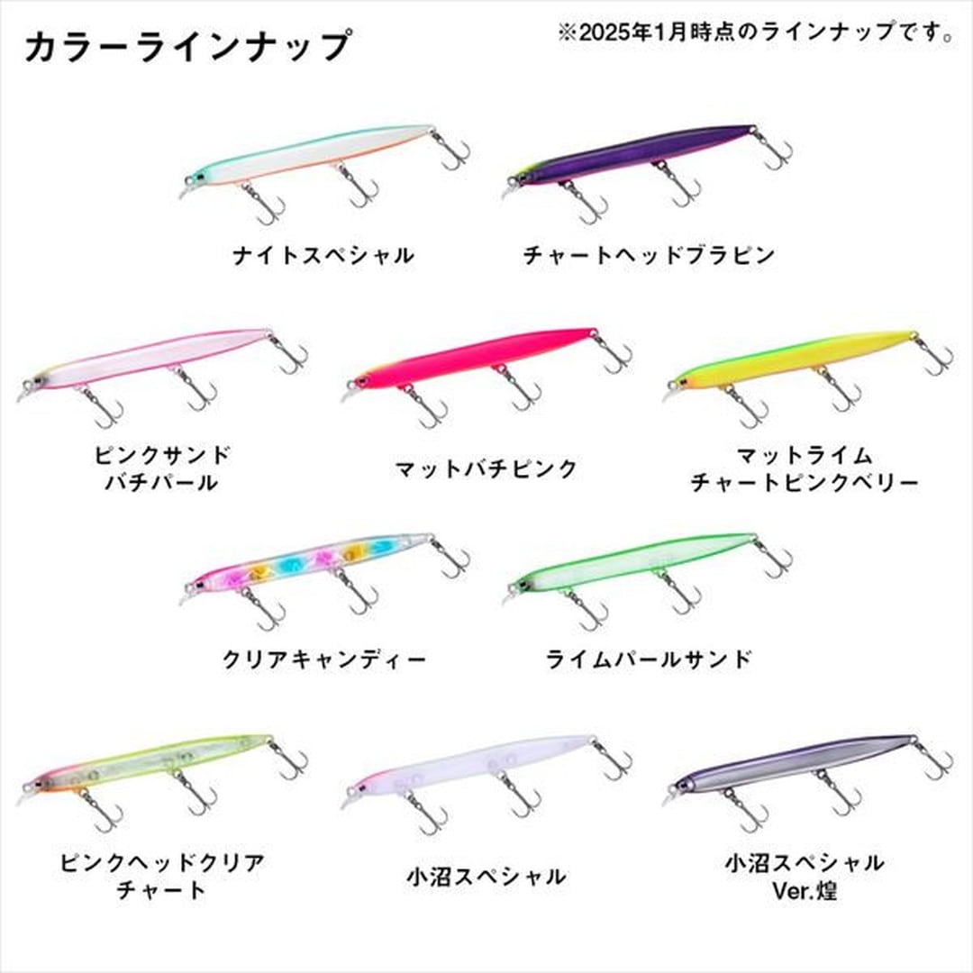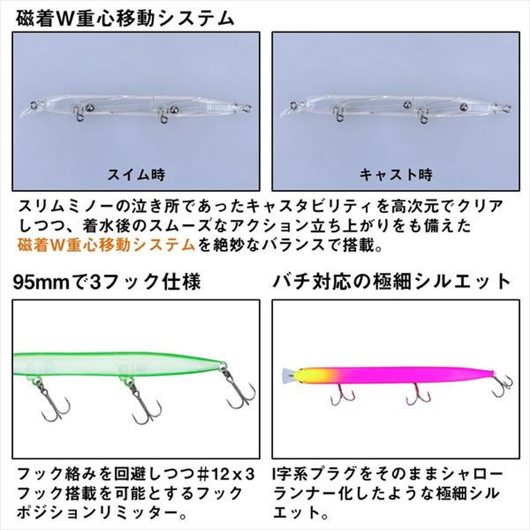 小沼正弥監修。密かに爆れ。バチ、サヨリ、シラス、激スレパターン対応、極細シルエットの水面直下攻略型ぶっ飛びシャローランナー。細身・小型ベイトに偏食している時、激スレ時に最適。バチ、サヨリ、シラスはもとより、イワシや稚アユ等の小型ベイトパターンにベストマッチな極スリムシルエット。高レスポンス&スレに強いタイトウォブンロール+テールスライドアクションで、低速~高速まで全てのリトリーブに対応。ロッドポジションとリトリーブ速度の組み合わせで水面直下~約30cmが有効レンジ。風雨等でI字系スリムプラグが太刀打ちできない状況でも、一枚下のレンジでしっかりアピールできる。極細ボディながら磁着重心移動を前後にダブルで搭載し、「スリムミノーは飛ばない」イメージをくつがえす快適なキャスタビリティと立ち上がり性能を両立。