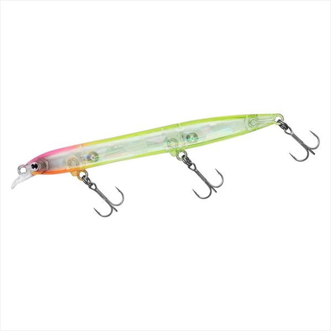 小沼正弥監修。密かに爆れ。バチ、サヨリ、シラス、激スレパターン対応、極細シルエットの水面直下攻略型ぶっ飛びシャローランナー。細身・小型ベイトに偏食している時、激スレ時に最適。バチ、サヨリ、シラスはもとより、イワシや稚アユ等の小型ベイトパターンにベストマッチな極スリムシルエット。高レスポンス&スレに強いタイトウォブンロール+テールスライドアクションで、低速~高速まで全てのリトリーブに対応。ロッドポジションとリトリーブ速度の組み合わせで水面直下~約30cmが有効レンジ。風雨等でI字系スリムプラグが太刀打ちできない状況でも、一枚下のレンジでしっかりアピールできる。極細ボディながら磁着重心移動を前後にダブルで搭載し、「スリムミノーは飛ばない」イメージをくつがえす快適なキャスタビリティと立ち上がり性能を両立。
