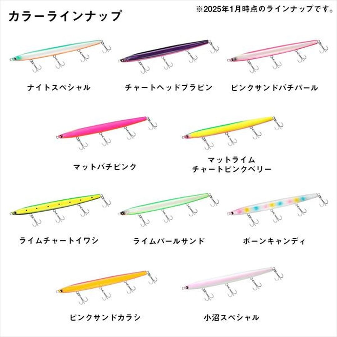 小沼正弥監修。「食わせ重視」の120S。スイッチヒッタースリム120Sは「食わせる」ことに特化したバチ抜けルアーであり、シーバスが特定のベイトに偏食している状況で効果を発揮する。スリムなボディは多様なベイトフィッシュに対応し、控えめなテールスライドアクションと時折入るチドリアクションが、スレたシーバスに食わせの間を与える。