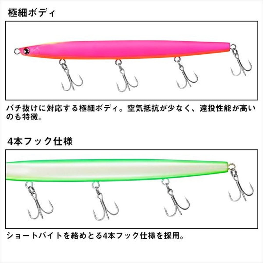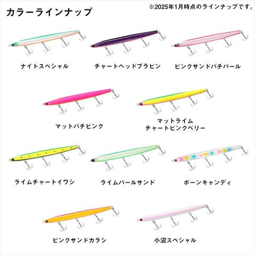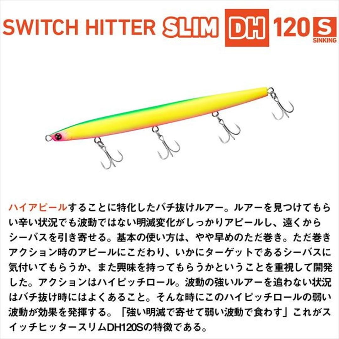 小沼正弥監修。「アピール重視」のDH120S。スイッチヒッタースリムDH120Sは「ハイアピール」を重視し、明滅変化によってシーバスを遠くから引き寄せる。ハイピッチロールの弱い波動は、強い波動に反応しないシーバスにも効果的であり、「強い明滅で寄せ、弱い波動で食わせる」ことが特徴である。DH=指名打者。飛距離第一主義というコンセプトもそのまま踏襲。