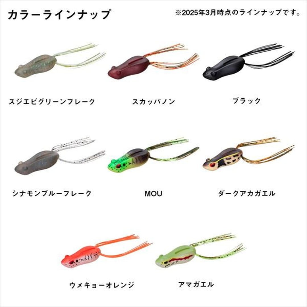 オフセットフックで使うエラストマー製フロッグ!梅田京介監修。フローティングのエラストマー素材を採用したオフセットで使うフロッグ。通常のドッグウォークから高速ドッグウォークまで幅広く対応し、カエル以外にエビやベイトフィッシュなども演出可能。長めに設定されたラバースカートがアクション時にブレーキの役割を果たし、短い移動距離で誘うことも可能。後方重心のボディは遠投はもちろんカバー奥へのスキッピングでも威力を発揮する。オフセットフックをセットしやすいフックセットアシストマーカーも搭載。初心者でも扱い易い。