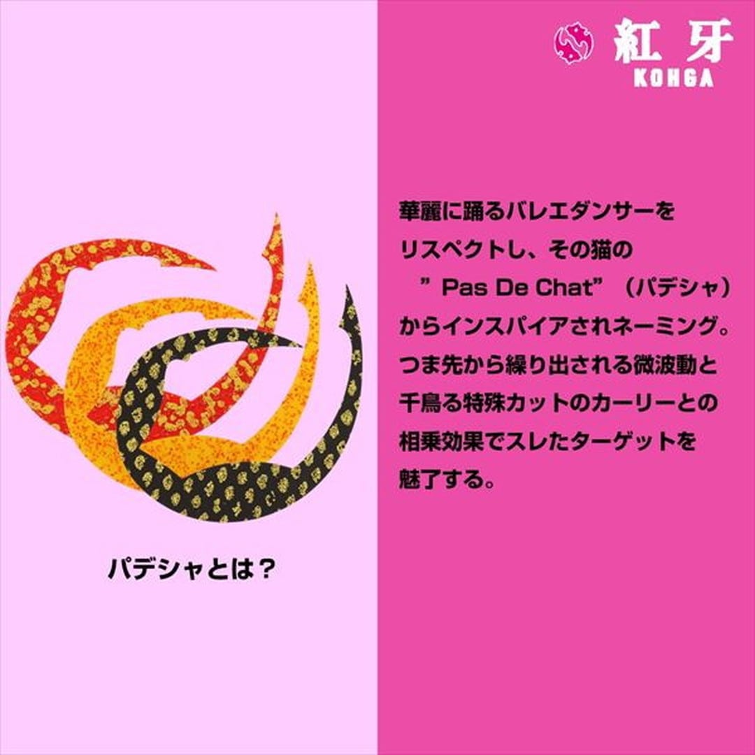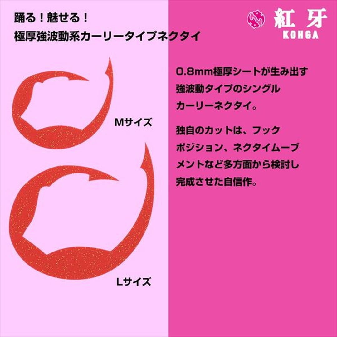 踊る!魅せる!極厚強波動系カーリータイプネクタイ。0.8mm極厚シートが生み出す強波動タイプのシングルカーリーネクタイ。独自のカットは、フックポジション、ネクタイムーブメントなど多方面から検討し完成させた自信作。パデシャとは●華麗に踊るバレエダンサーをリスペクトし、その猫のステップ「Pas De Chat(パデシャ)」からインスパイアされネーミング。つま先から繰り出される微波動と千鳥る特殊カットのカーリーとの相乗効果でスレたターゲットを魅了する。