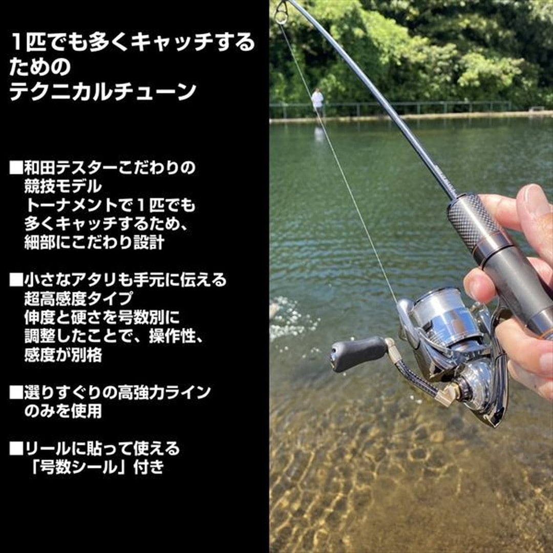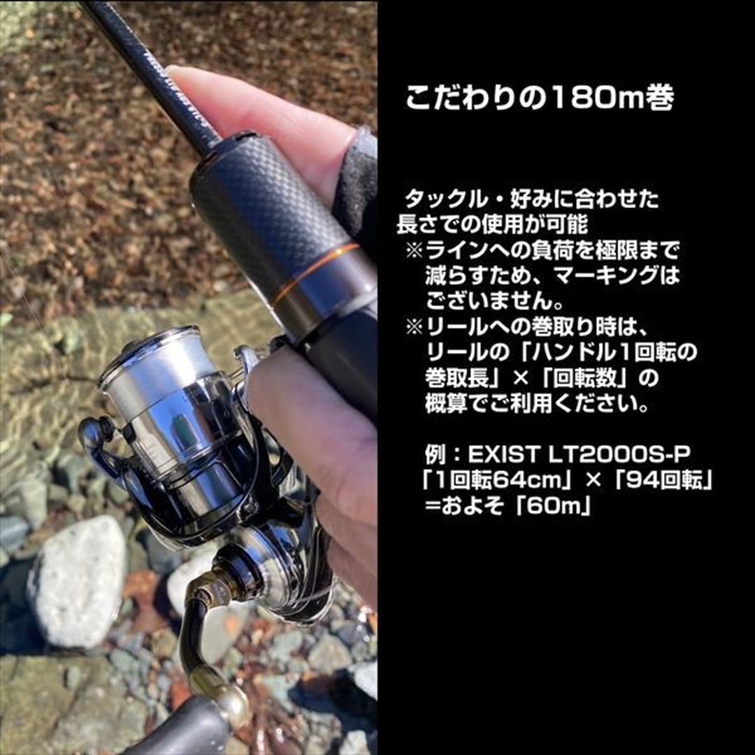 和田テスターこだわりの競技モデル!1匹でも多くキャッチするためのテクニカルチューン(TT)! 小さなアタリも手元に伝える超高感度タイプ。伸度と硬さを号数別に調整したことで、操作性、感度が別格。選りすぐりの高強力ラインのみを使用。こだわりの180m巻。タックル・好みに合わせた長さでの使用が可能。※ラインへの負荷を極限まで減らすため、マーキングはございません。※リールへの巻取り時は、リールの「ハンドル1回転の巻取長」×「回転数」の概算でご利用ください。例:EXIST LT2000S-P「1回転64cm」×「94回転」=およそ「60m」。平行巻DPLS。リールに貼って使える「号数シール」付き。