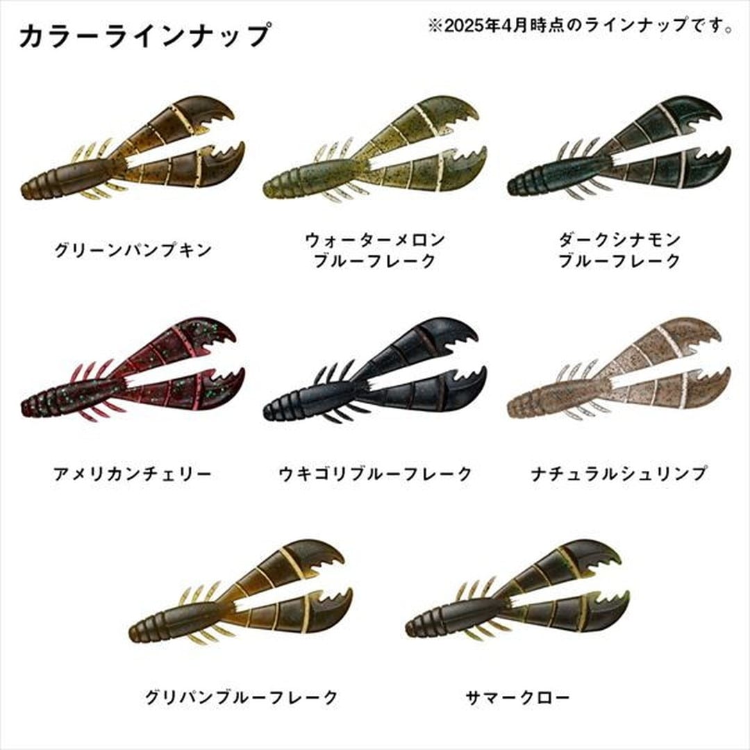 バタバタ動く爪で魚の本能を刺激するハイパワージョイントクローワーム。シャローの近距離戦を得意とするクローワーム。4連結ジョイント構造の爪は、着水直後からアクションを始め、艶めかしくもバタバタ水を強く掻き、魚へ強烈にアピールする。また、ジョイントのおかげで着底からの倒れ込みは爪が遅れて倒れバイトチャンスを誘発させる。大ぶりな爪は、フリップやピッチングの際に振り子の役目を果たし、ストレスなくキャストすることが可能となっている。琵琶湖ガイド 島後英幸監修。4連結ジョイント構造の爪で着水から着底まで常にアピール。爪側にもウエイトがありフリップorピッチングしやすいネイルを刺せばバックスライドにも対応